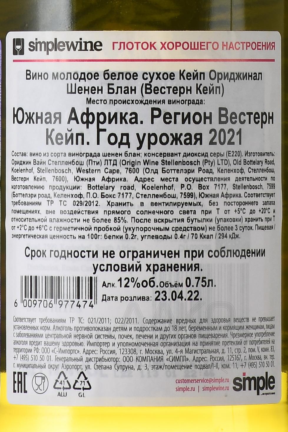 Белое сухое вино Cape Original Chenin Blanc Western Cape 2021 г. 0,75 л из региона ЮАР Западный Кейп отличается 12-процентной спиртуозностью и классическим составом из одного виноградного сорта, собранного в течение ограниченного урожайного сезона ручным способом. После тщательной сортировки сырье подверглось ферментации в стальных цистернах с термоконтролем и фильтрации. Также некоторое время вино вызревало в нейтральных металлических баках.