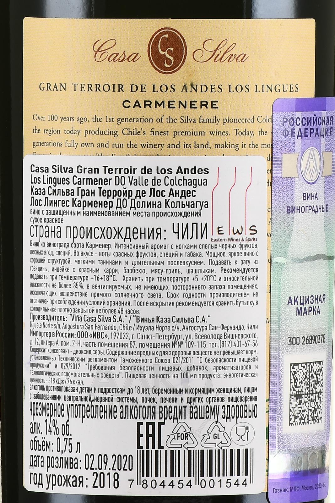 Красное сухое вино Casa Silva Gran Terroir de Los Andes Los Lingues Carmenere 2018. — выдающийся чилийский винтаж, призванный продемонстрировать особенности терруара местности происхождения: сухого климата Долины Кольчагуа. Мацерация и ферментация винограда осуществились в стальных цистернах при контролируемых температурных значениях. Для выдержки также применялись емкости на основе стали и дубовые бочонки французского происхождения. Крепость вина составляет 14 градусов.