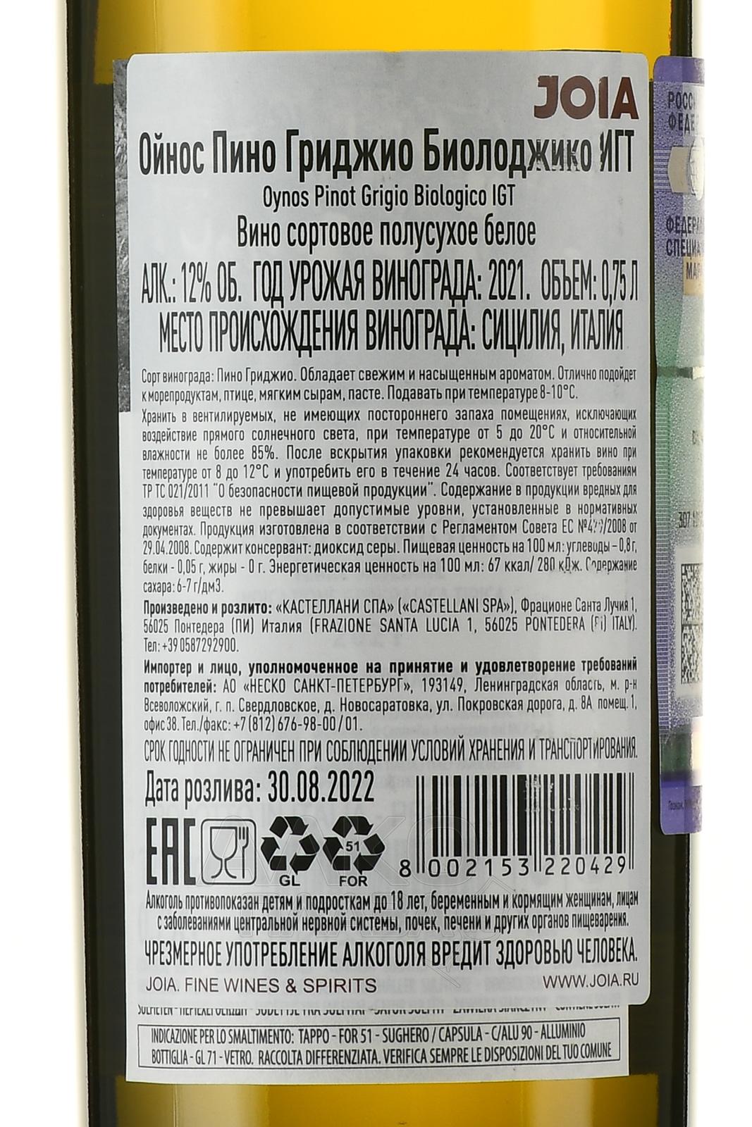 Oynos Pinot Grigio Biologico - белое вино с небольшим остаточным сахаром, классифицированное как полусухое. Виноград для производства выращен на винограднике, обрабатываемом органическими принципами. Собранный урожай был доставлен на винодельню, где его отсортировали, спрессовали и настояли на мезге при низкой температуре. Алкогольное брожение и выдержка осуществлялись в чанах из нержавеющей стали.