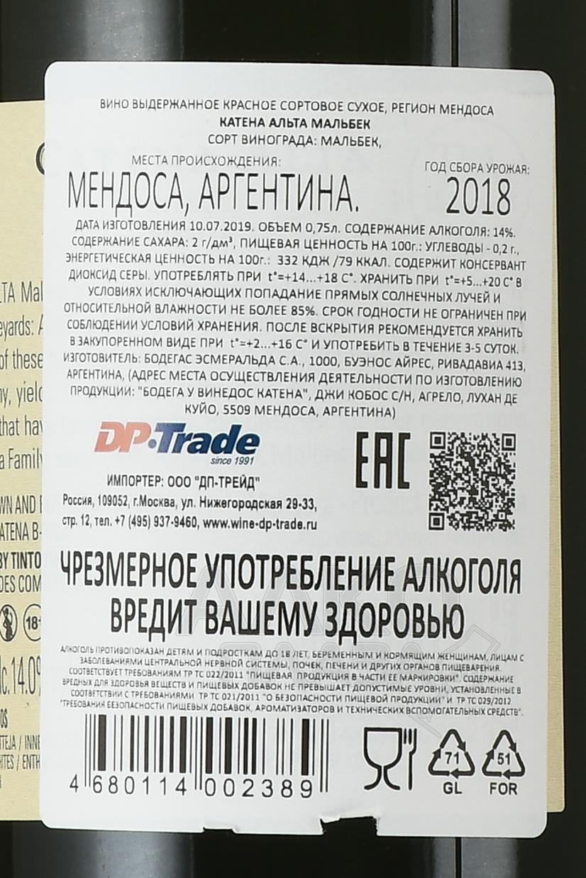 Красное сухое вино Catena Alta Malbec 0,75 л — моносортовой образец, для производства которого используются ягоды, собранные с четырех участков, высота которых колеблется от 950 до 1500 метров над уровнем моря. После сортировки и прессования происходит мацерация при низкой температуре на протяжении 28 месяцев с дальнейшей винификацией в дубе, причем для каждого виноградника по отдельности. Созревание готового вина проходило в бочках из французского дуба, 70% из которых первого наполнения, в течение 18 месяцев.