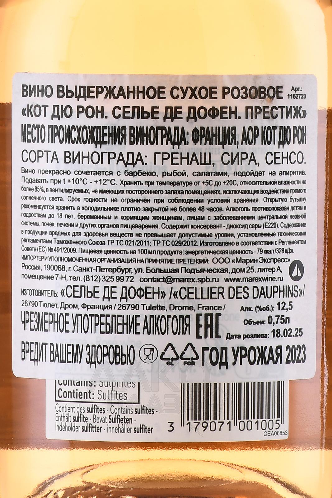 Розовое сухое вино Cellier des Dauphins Cotes du Rhone Prestige 0,75 л — элегантный купаж из трех сортов, которые поступают с угодий Долины Роны. Виноград собирают на пике зрелости, давят и несколько часов мацерируют на мезге. Затем сусло процеживают и сбраживают в стальных чанах при контролируемой температуре. Вино не подвергается длительной выдержке и раскрывает все свои достоинства в молодом возрасте.