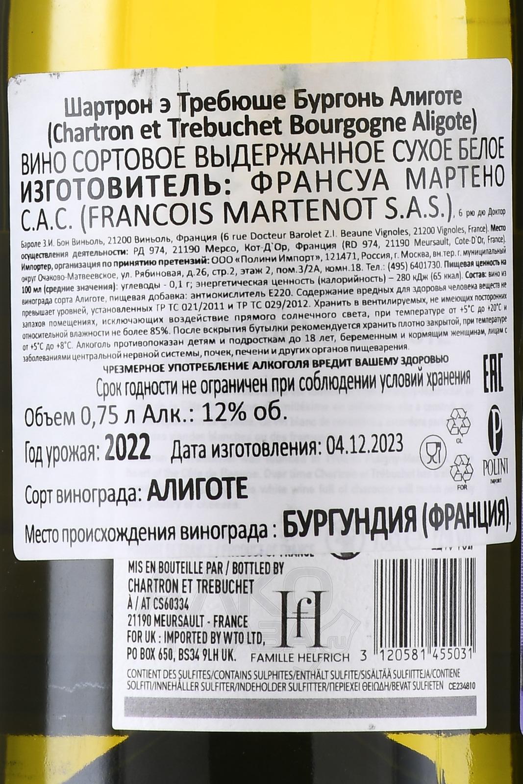 Chartron et Trebuchet Bourgogne Aligote - вино Шартрон э Требюше Бургонь Алиготе 0.75 л белое сухое