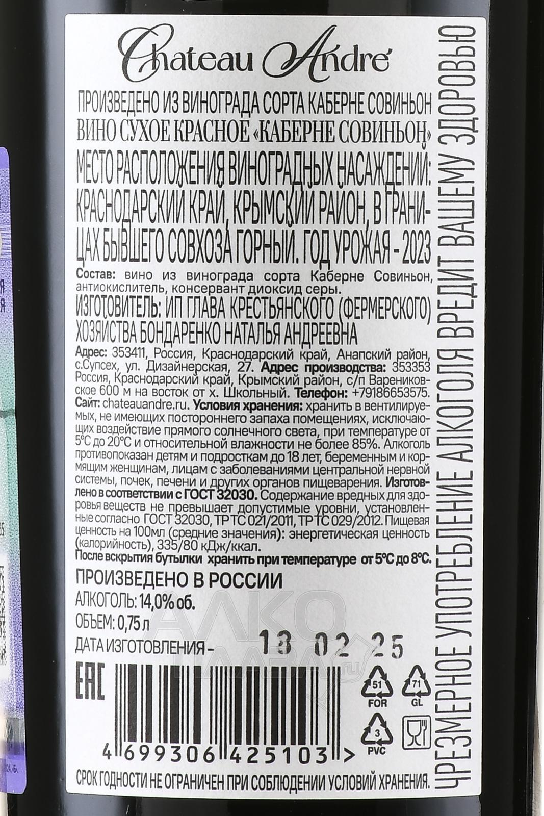 Красное сухое вино Chateau Andre Cabernet Sauvignon 0,75 л. отражает характер терруара и сорта Каберне Совиньона. Он был выращен на виноградниках Крымского района Краснодарского края в границах бывшего совхоза «Горный». Урожай собирали вручную в оптимальной степени зрелости, что позволило сохранить естественную концентрацию вкуса. После тщательной сортировки ягоды проходили бережное прессование, затем осуществлялась винификация по традиционному европейскому методу производства красных вин. Выдержка проводилась в стальных емкостях, что позволило подчеркнуть изящные фруктовые и пряные оттенки, сохраняя естественную свежесть и баланс.