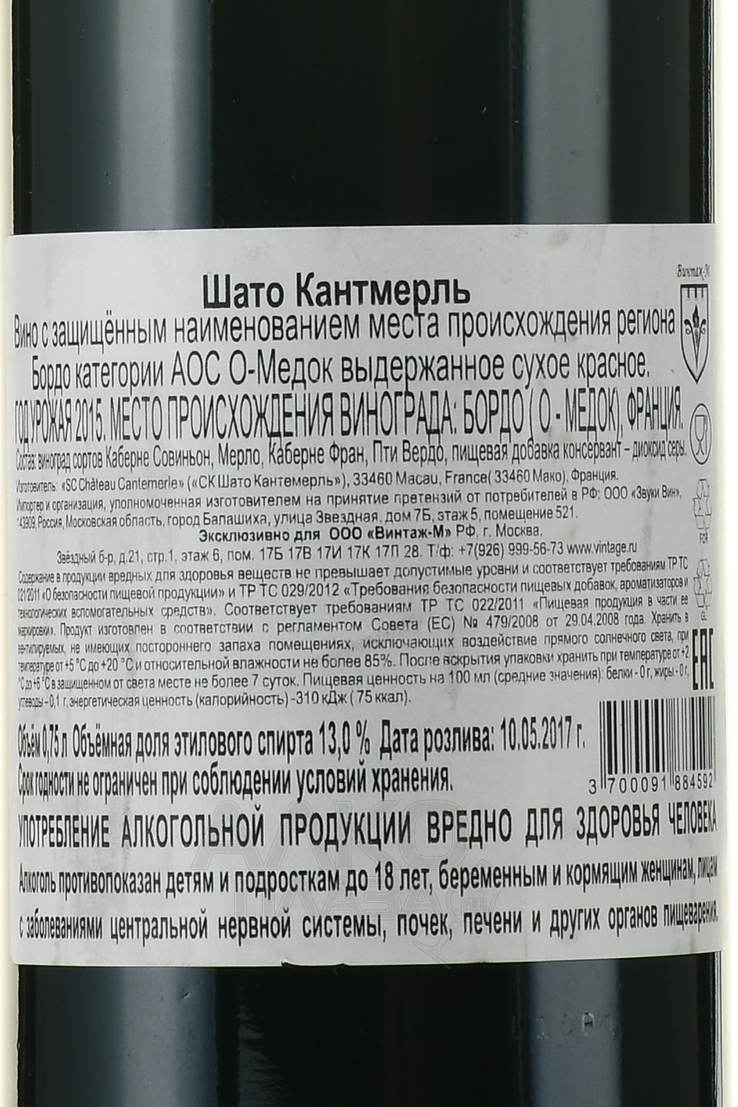 Красное сухое вино Chateau Cantemerle, Haut-Medoc AOC 0.75 л с защищенным наименованием места происхождения региона Бордо, которое изготавливается из винограда сортов Мерло, Каберне Фран, Каберне Совиньон, Пти Вердо, выращенных в О-Медоке и собранных вручную в определенный год. По окончании ферментации, которая длилась около недели, наступает мацерация в течение месяца, далее вино выдерживается один год в бочках из древесины французского дуба, 40 процентов из которых новые. Потенциал развития — 10-15 лет. Вино Шато Кантмерль — одним из последних попало в список Пятого Гран Крю в Официальной классификации бордоских вин 1885 года.