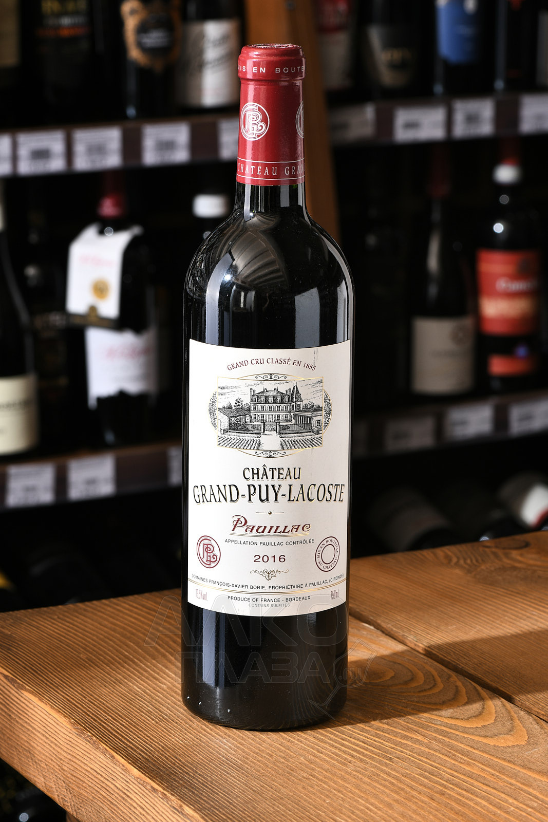 Chateau Grand-Puy-Lacoste Pauillac AOC — великолепное красное сухое вино, созданное из винограда, лозы которого имеют возраст в среднем 40 лет. Урожай был собран в период с 28 сентября по 13 октября, ягоды прошли тщательную сортировку. Винификация проходила в стальных емкостях продолжительностью около трех недель. Последующее созревание напитка происходило в бочонках из французского дуба приблизительно 18 месяцев. Потенциал хранения в бутылке винтажа 2016 года составляет не менее 25 лет.