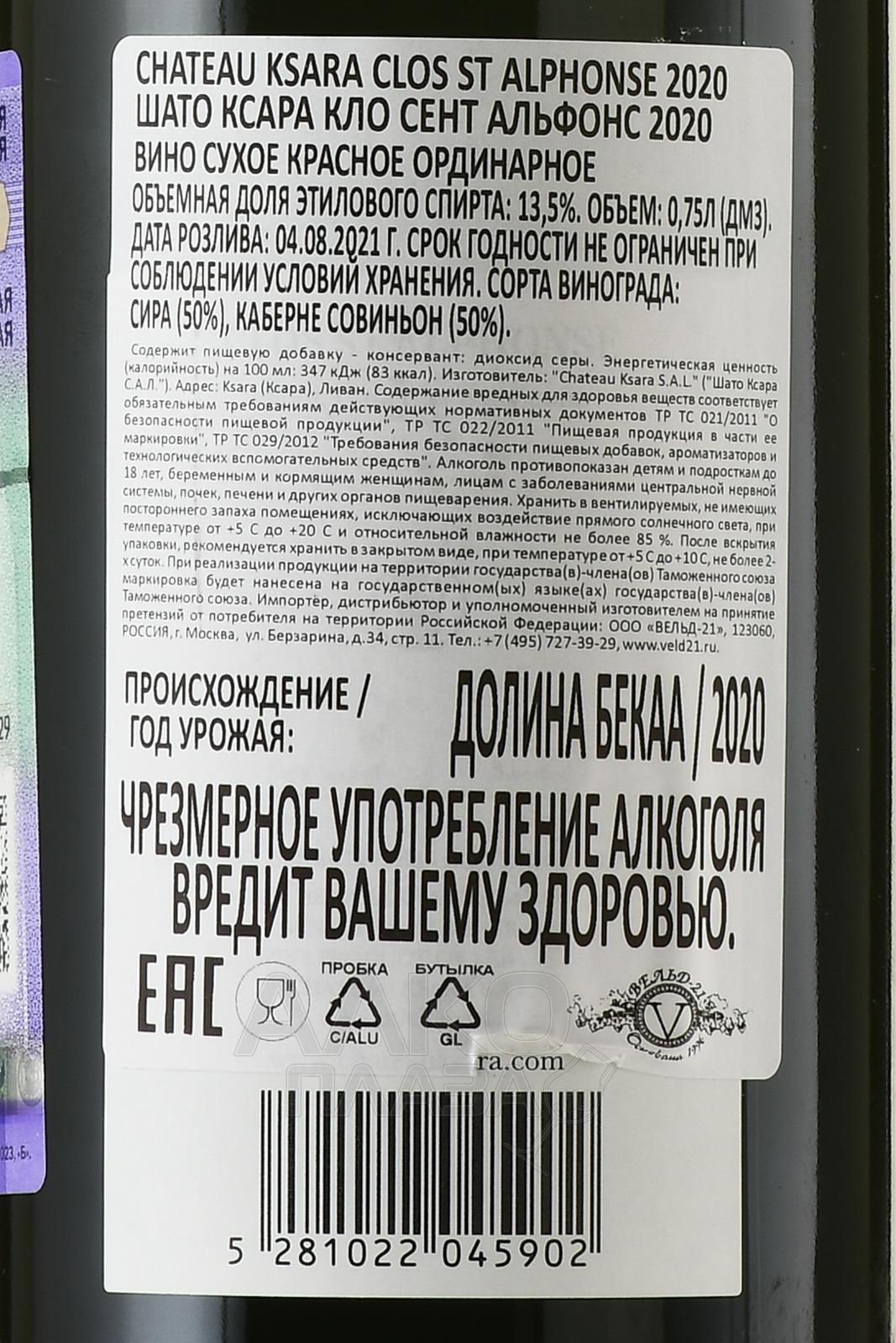Красное сухое вино Chateau Ksara Clos St Alphonse 2020 г. 0,75 л происходит из ягод двух популярных мировых сортов, выращенных в полуконтинентальном климате ливанской долины Бекаа на каменистых почвах на высоте 1000 метров над уровнем моря. Химические препараты здесь не используются, поэтому урожаи созревают экологически чистыми. Плоды собрали вручную и очистили на винодельне от стебельков. Партии сырья винифицировали отдельно: для Сиры использовали кратковременную выдержка, для Каберне – продолжительную ферментацию. Сброженное сусло самотеком и путем прессования перелили в бетонные резервуары для яблочно-молочного брожения. Затем напиток созревал на протяжении 14-18 месяцев также в бетоне.