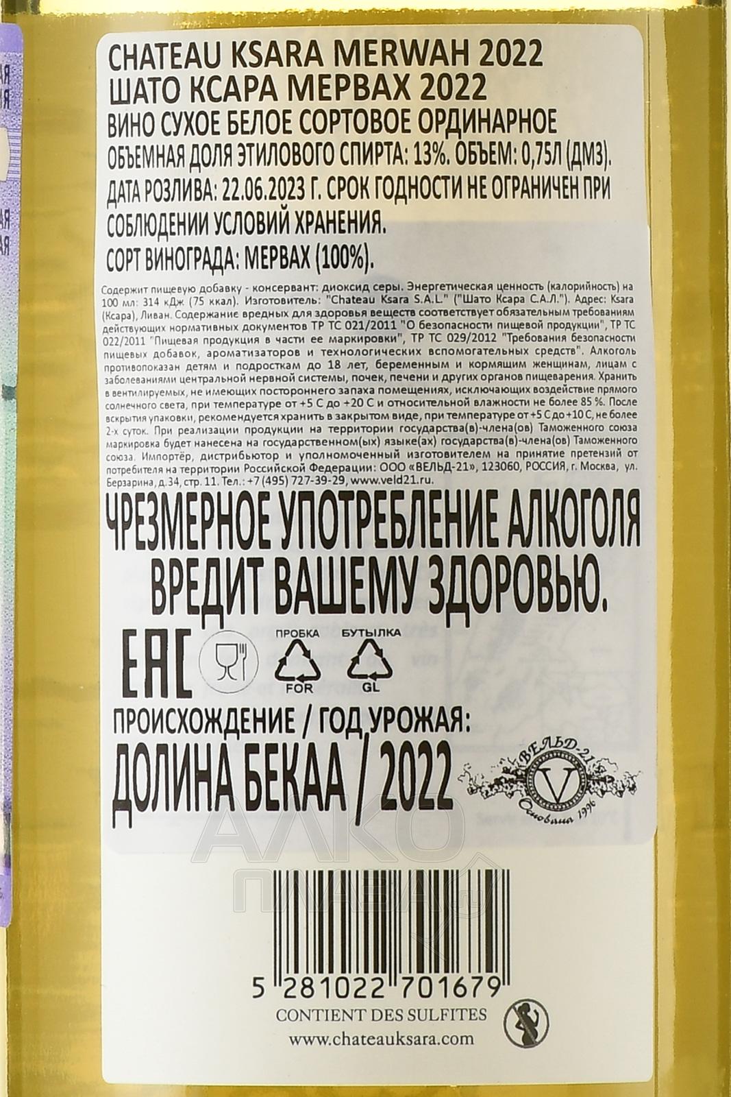 Chateau Ksara Merwah - ливанское белое сухое вино из местного сорта винограда Мервах. Виноградники расположены в Долине Бекаа на высоте свыше 1600 метров над уровнем моря. Возраст лоз 60 и более лет. Сбор урожая ручной.