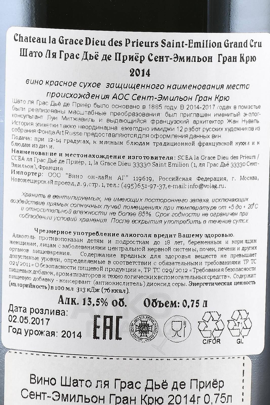 Chateau La Grace Dieu des Prieurs Saint-Emilion Grand Cru - вино Шато ля Грас Дьё де Приёр Сент-Эмильон Гран Крю Михаил Врубель 2014 год 0.75 л красное сухое