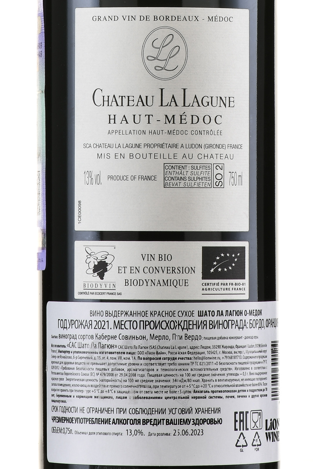 Красное сухое вино Chateau La Lagune Haut-Medoc AOC 3 Grand Cru Classe 2021 г 0,75 л — великолепный купаж в классическом бордоском стиле. Для производства использовались сорта Каберне Совиньон, Мерло и Пти Вердо, выращенные в апелласьоне О-Медок, на участках со статусом Гран Крю 3-го класса. Урожай 2021 года получился отличным и был собран на пике спелости. Винификация протекала в чанах из нержавеющей стали с терморегуляцией. Винтажное вино выдерживалось в дубовых бочках 18 месяцев (80% новые). Потенциал хранения в бутылке составляет до 40 лет.