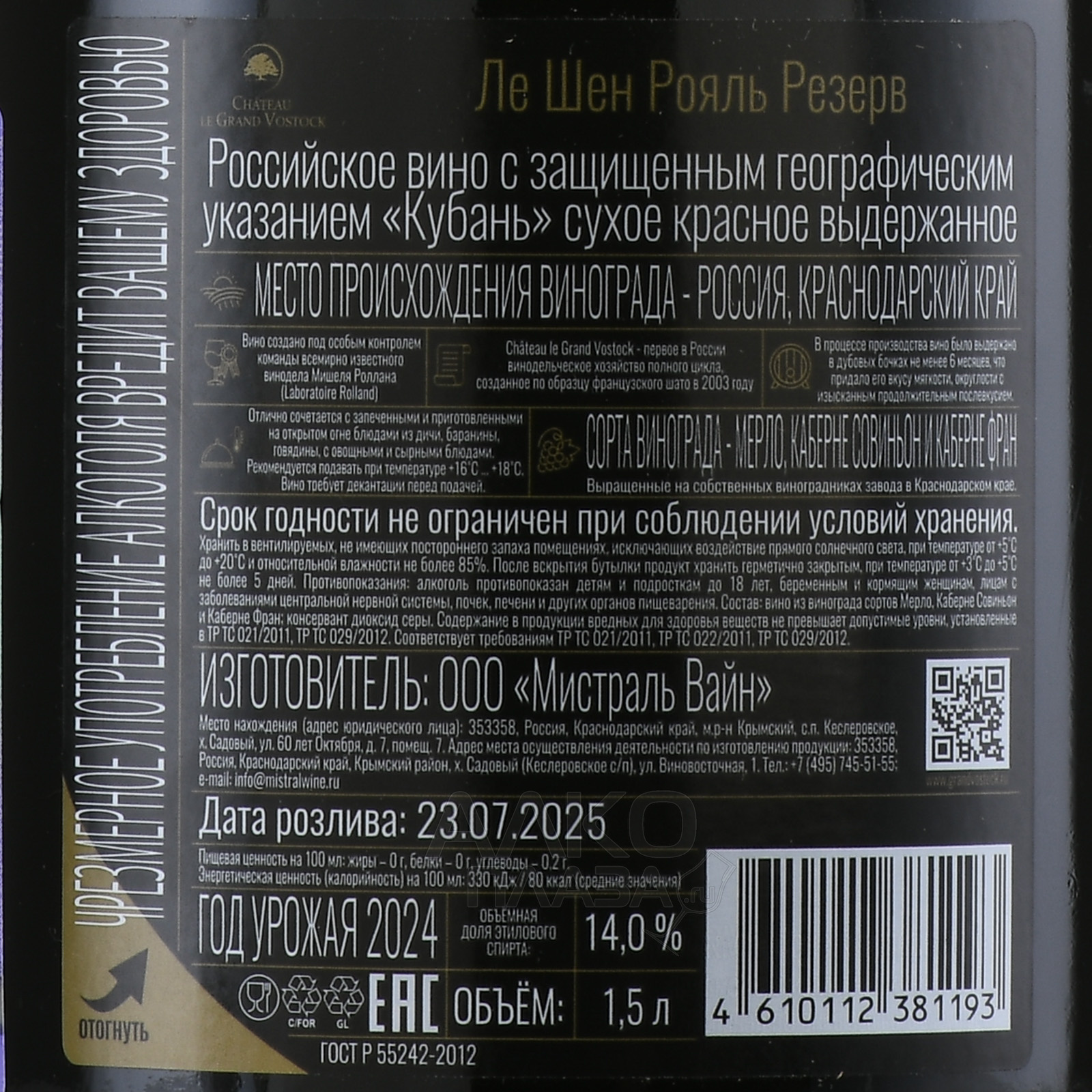 Chateau le Grand Vostock Le Chene Royal Reserve - вино Шато ле Гран Восток Ле Шен Рояль Резерв 1.5 л красное сухое в п/у