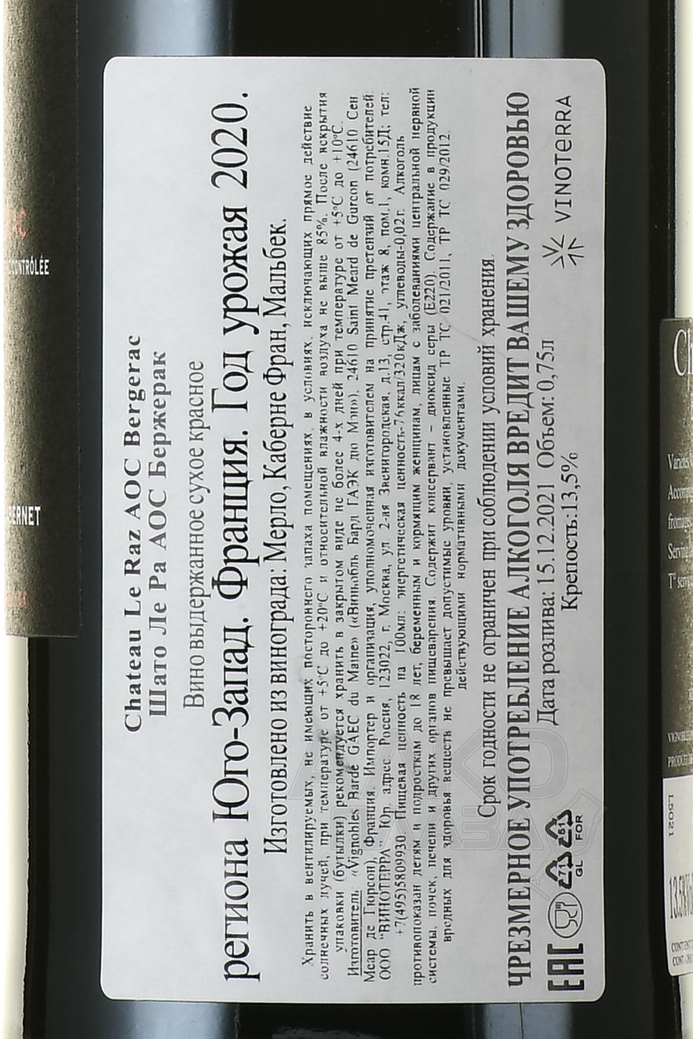 Красное сухое вино Chateau Le Raz Bergerac AOC 2020 год 0,75 л — напиток среднего ценового сегмента, который классифицируется согласно требованиям категории AOC. Сбор урожая (трех вариаций винограда европейской группы) проводился в юго-западной части Франции на известняково-глинистых угодьях, перемежаемых отложениями железа. Сырье прошло гребнеотделение, а чуть позже — сбраживание в определенном диапазоне температур и алкогольную ферментацию. Выдержка на осадке заняла не более двенадцати месяцев.