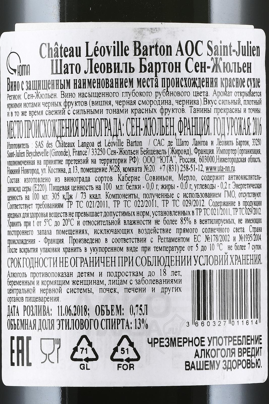 Красное сухое вино Chateau Leoville Barton Cru Classe Saint-Julien 2016 год 0,75 л создано в бордосском апелласьоне Сен-Жюльен из винограда двух сортов, который собрали в пределах одного года на плантациях семьи Бартон. Эти угодья образованы дренированными отложениями щебня с примесью глинистых пластов. Обработка спелого урожая с яркими терруарными особенностями проходила по методу терморегулируемой винификации, после этого вино долго выдерживали в дубе. Его потенциал хранения оценивается экспертами в тридцать-пятьдесят лет.