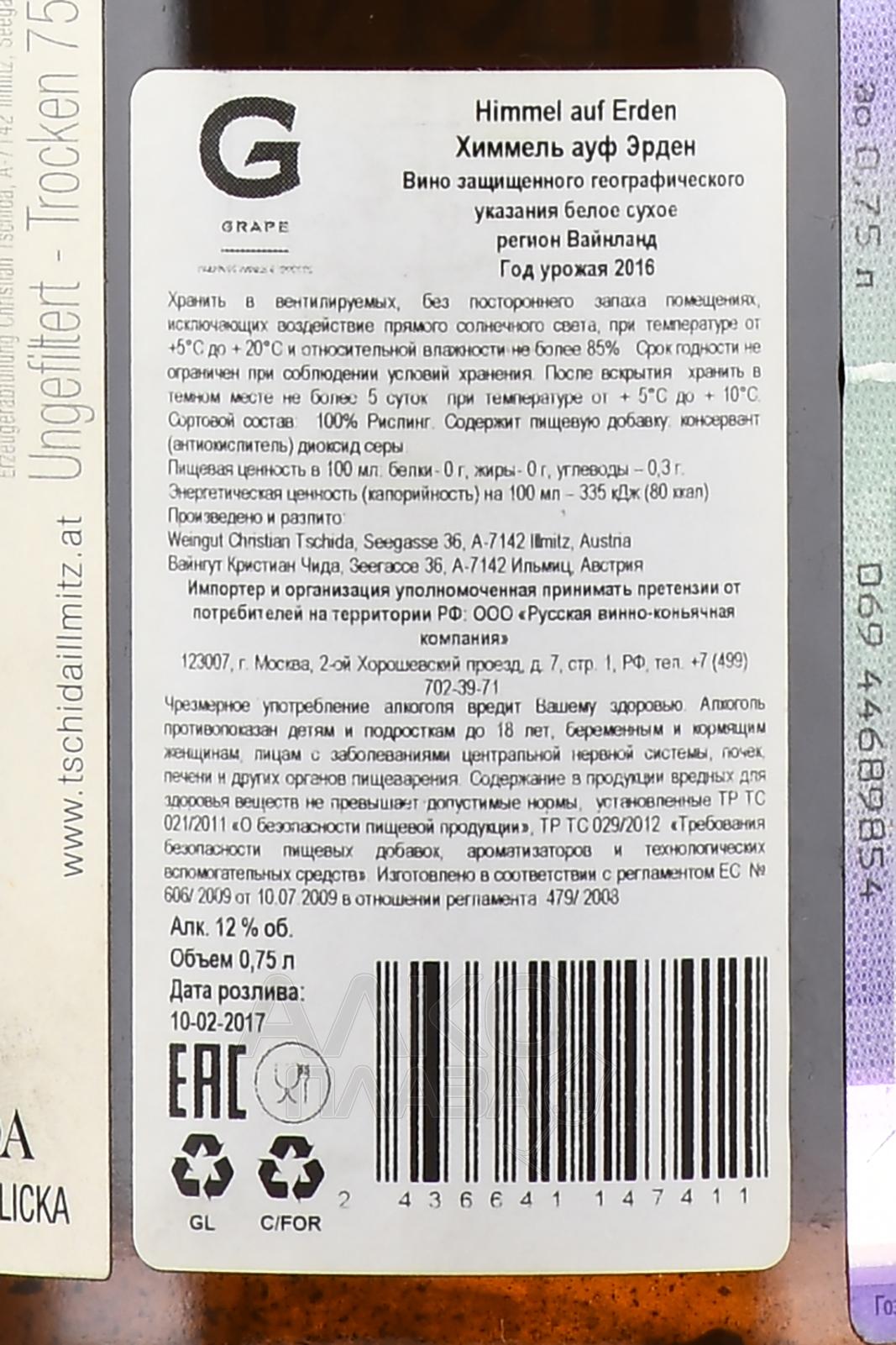 Кюве сортов Шойребе и Пино Блан от старых лоз было получено после прессования ногами. Окончив спонтанное брожение, вино в течение года созревало в больших дубовых бочках, а затем было разлито в бутылки без фильтрации и добавления серы. Белое вино Christian Tschida, "Himmel auf Erden" — уникальное, парадоксальное и в высшей степени необычное.