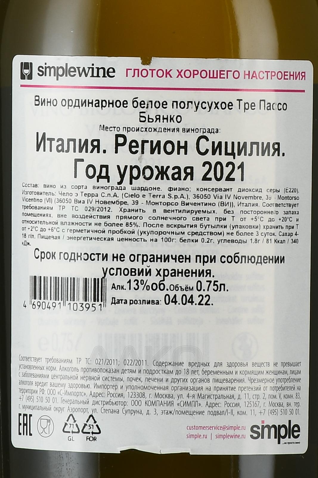 Белое полусухое вино Cielo e Terra 3 Passo Bianco 0,75 л — купаж из двух традиционных для Италии сортов, которые выращиваются в теплом и солнечном климате острова Сицилия. Виноградники разбиты на участках с глинистыми почвами, которые богаты известняком. Сбор сырья осуществляется на пике зрелости вручную, затем его подвергают гребнеотделению и прессованию. Процесс винификации протекает при контролируемой температуре в емкостях из нержавеющей стали. Вино отдыхает непродолжительное время в стальных чанах и бутилируется после осветления и мягкой фильтрации.
