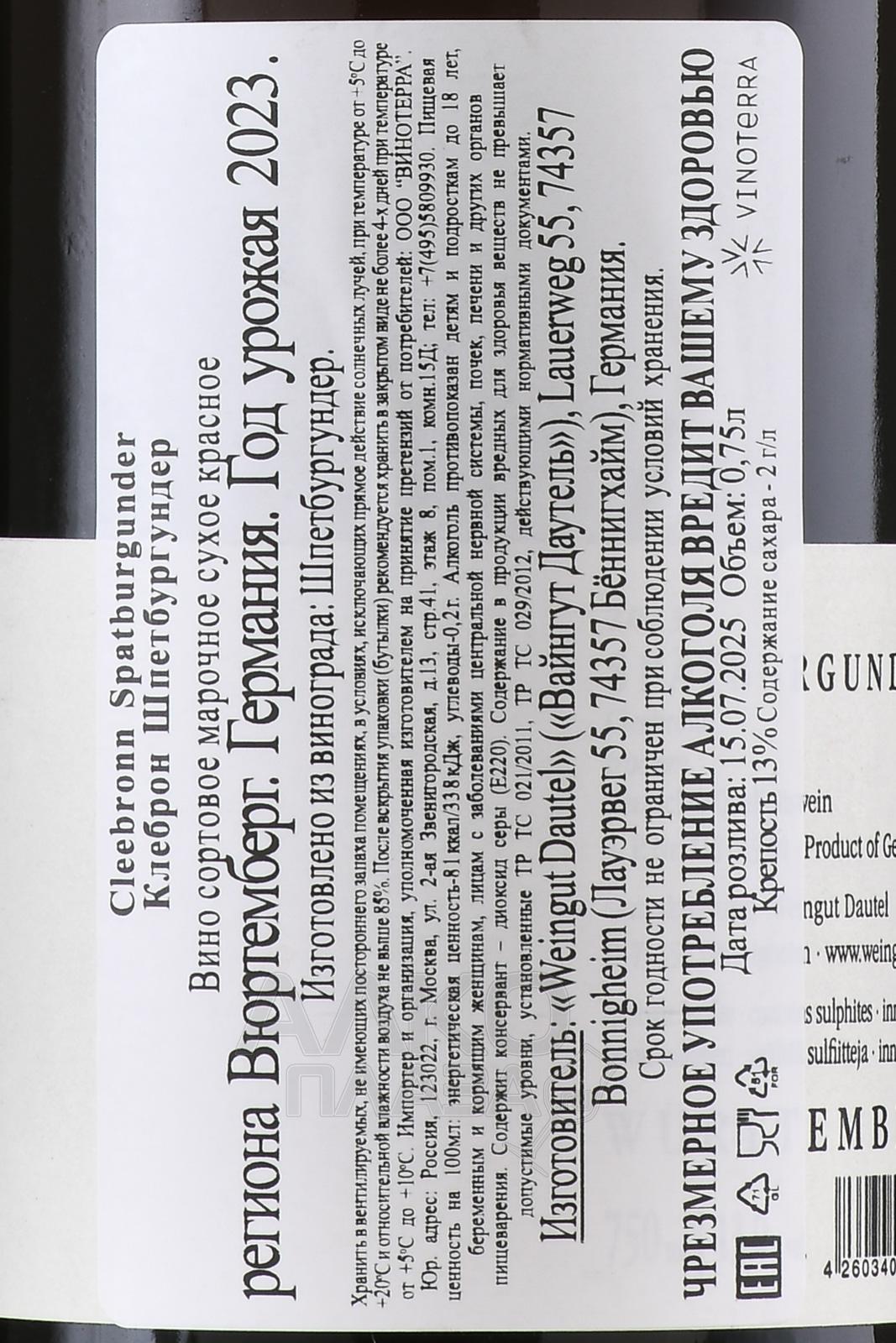 Красное сухое Dautel Cleebronn Spatburgunder 0,75 л — классический сортовой алкоголь Германии на базе распространенного в этой стране сорта Пино Нуар (Шпетбургундер), который культивировали в Бадене, коммуне Клееброн. Ягоды вырастили на дренированных почвах, содержащих большой процент красного песчаника, и собрали в течение одинакового года урожая. Сырье сорвали с лоз исключительно вручную и в кратчайшие сроки транспортировали на завод для проведения классической винификации в деревянной таре с терморегулировкой. Вино выдерживалось в объемных бочонках из дубовой цельной древесины.