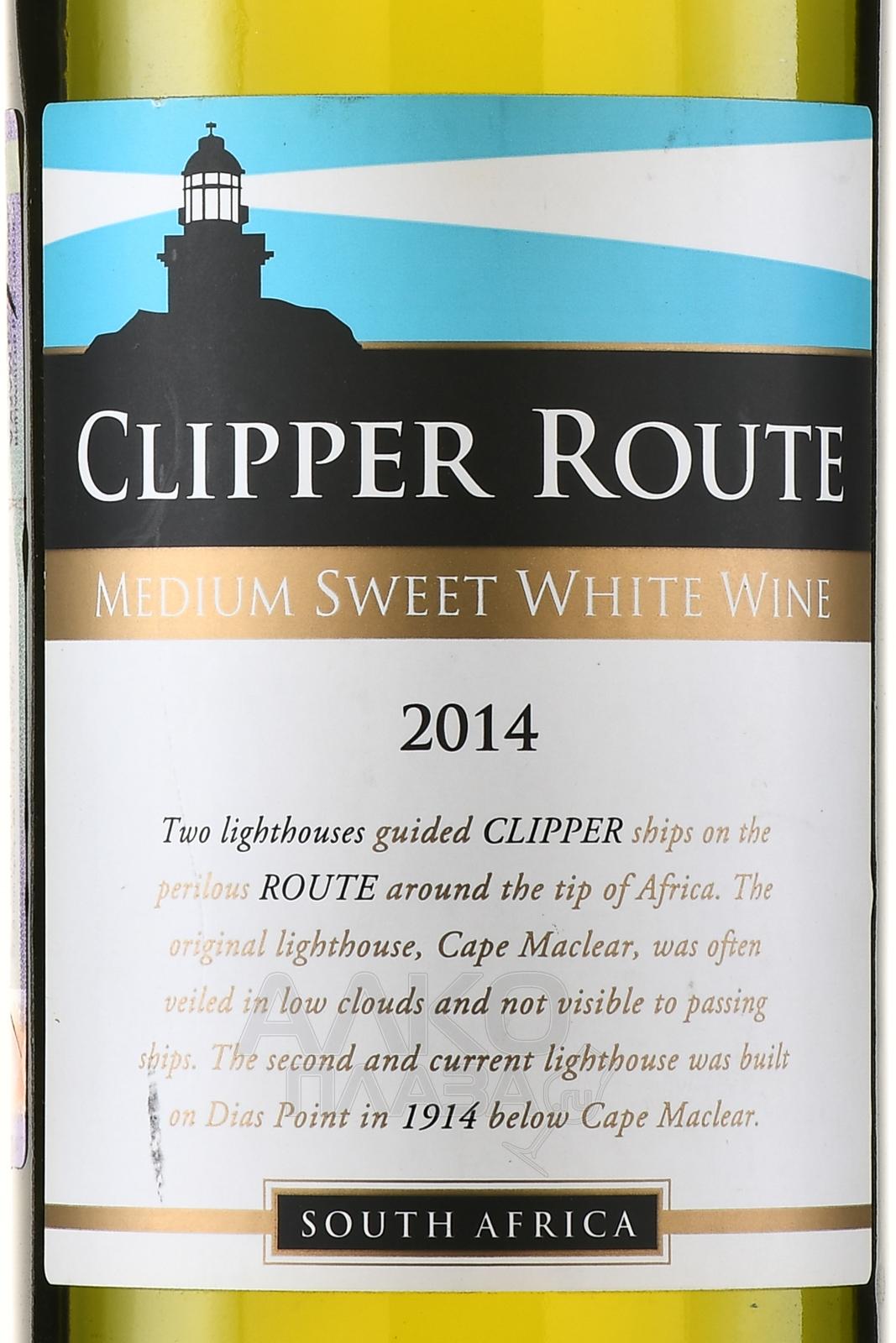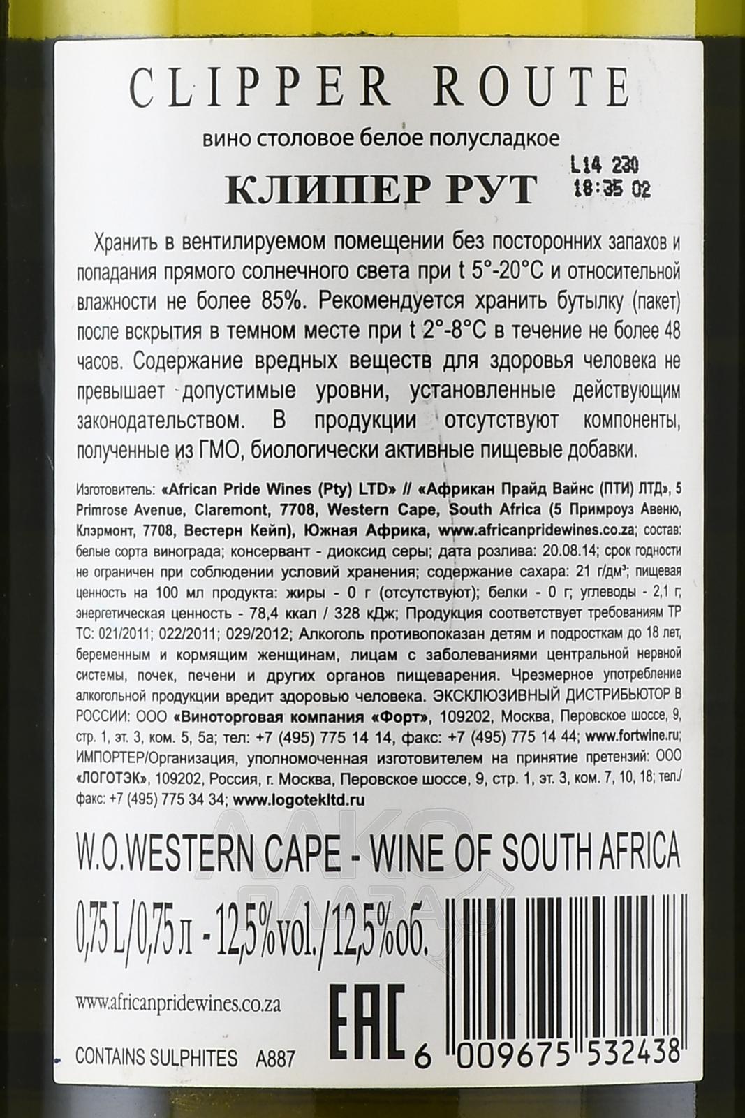 Белое полусладкое вино Clipper Route 2014 г. 0,75 л — натуральный напиток из двух виноградных вариаций, выращенных в уникальном терруаре ЮАР. Урожай ягод для этого алкоголя собрали в течение одного года и подвергли традиционной обработке с применением отжима и сбраживания при контролируемой температуре. Когда сахаристость вина достигла необходимых показателей, ферментацию прервали.