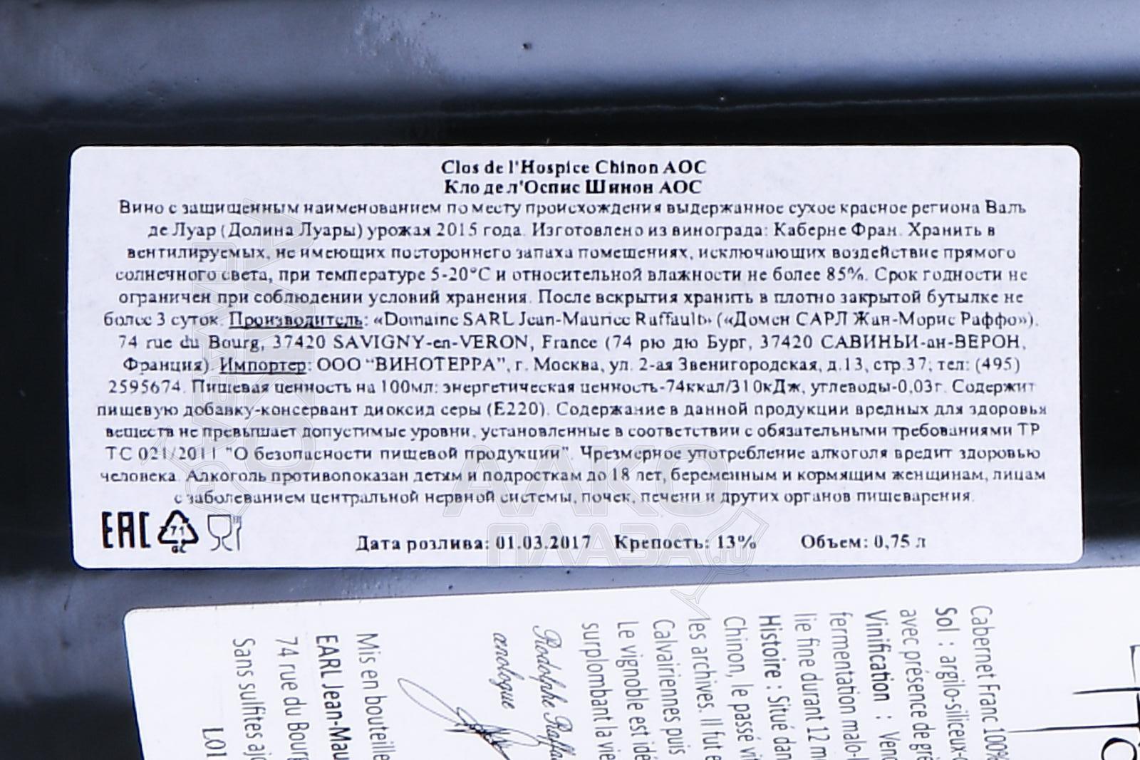 Красное сухое вино Jean-Maurice Raffault Clos de l`Hospice Chinon AOC 2015 г. 0,75 л – винтажный сорт из Долины Луары. Он происходит с исторических виноградников, когда-то принадлежавших потомкам французского писателя Франсуа Рабле. Сейчас эти плантации имеют органический сертификат. Лозы растут в природном амфитеатре на юго-восточных склонах, сложенных из песчаника, известняка и глины. Ягоды собирают вручную, после сортировки мацерируют и ферментируют на природных дрожжах в течение 30 дней. Затем следует яблочно-молочное брожение в 500-литровых бочках и выдержка на тонком осадке на протяжении 12 месяцев. При винификации в напиток не добавляют сульфиты.