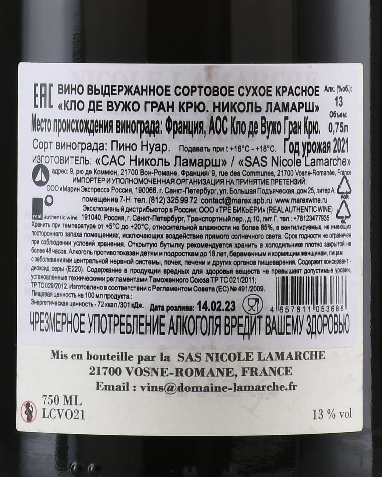Красное сухое вино Clos De Vougeot Grand Cru AOC Nicole Lamarche 0,75 л — марочное, обладающее индивидуальностью и богатым, многогранным букетом. Его стоит приобрести в подарок, с целью коллекционирования или инвестирования. Характер вина, изготовленного из сорта Пино Нуар с лучших виноградников Кло де Вужо и выдержанного не менее 18 месяцев в дубе, ярко раскрывает особенности терруара и года урожая, который был сухим и жарким, что позволило винограду хорошо вызреть, накопив много вкусоароматических веществ.