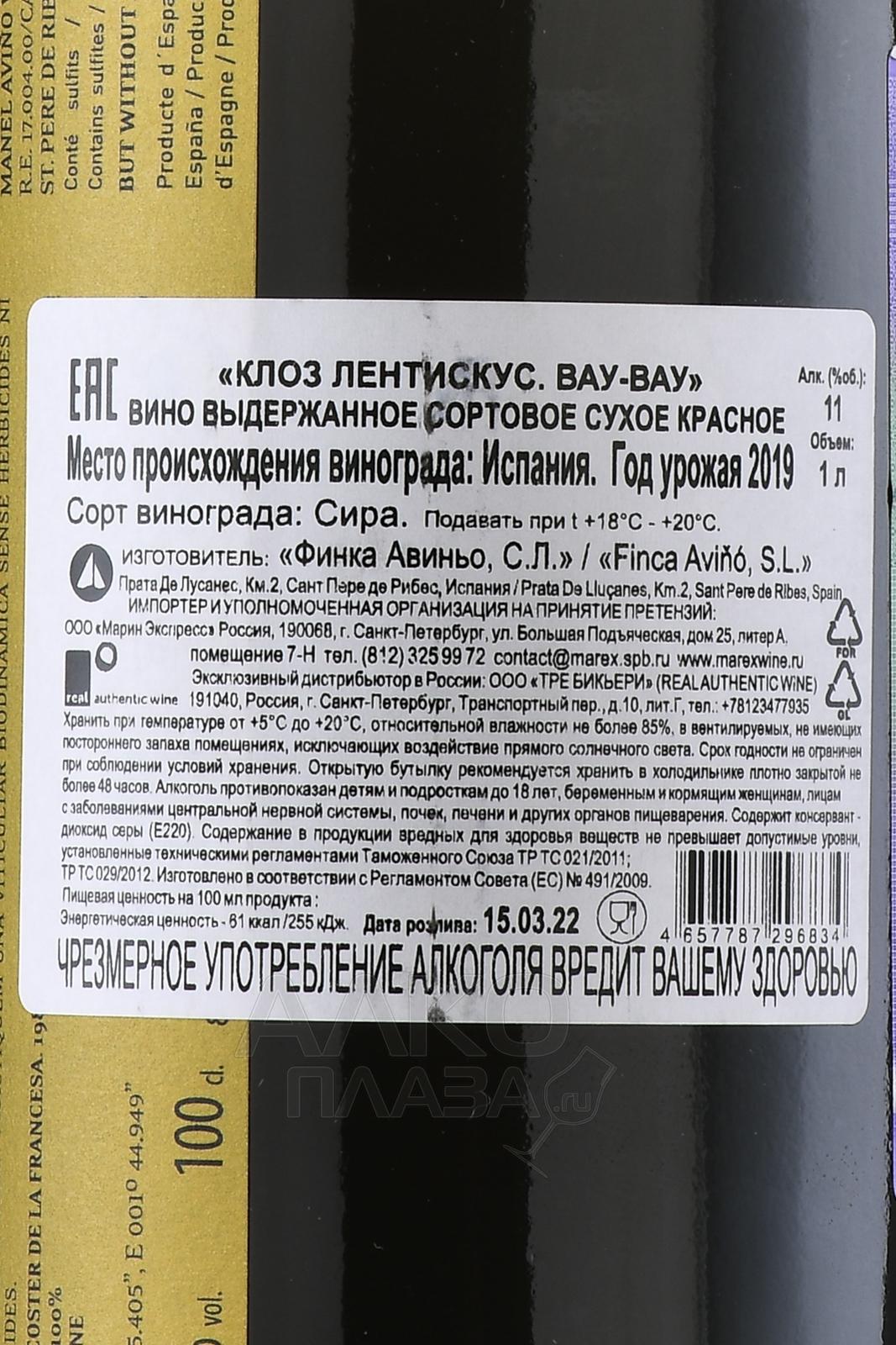 Красное сухое вино Clos Lentiscus Wow Wow 1 л изготавливается с применением биодинамических и органических методов из сорта Сира, который культивируется на виноградниках каталонской провинции Пенедес. Виноград выращивается на участках с плотными известняковыми почвами, содержащими достаточное количество глины, и собирается только вручную. Сырье подвергается гребнеотделению и дроблению в пневмопрессе, затем сусло настаивается на мезге 20 дней. Ферментация осуществляется в амфорах, в них же вино выдерживается некоторое время. В напиток не добавляются сульфиты.