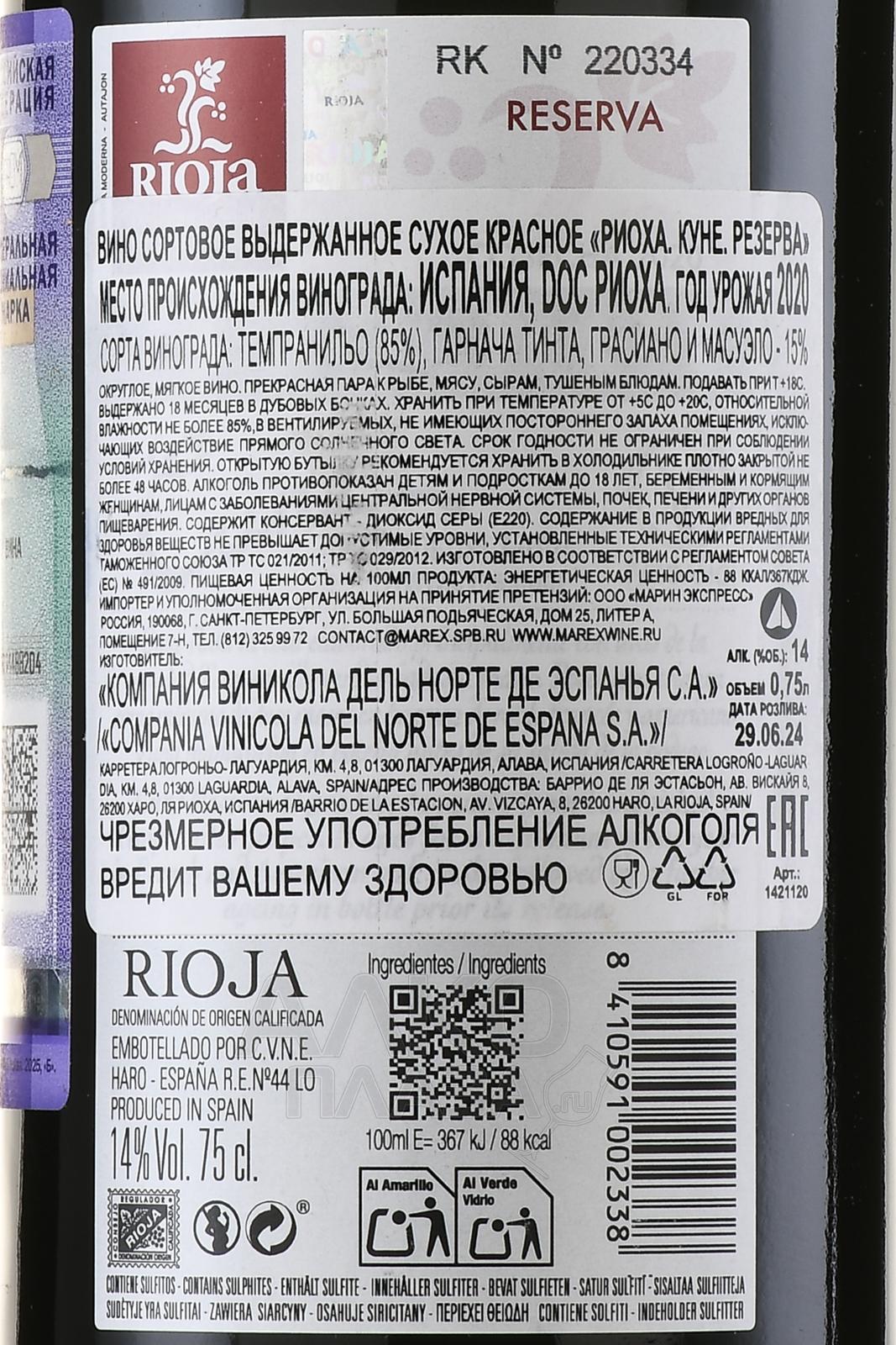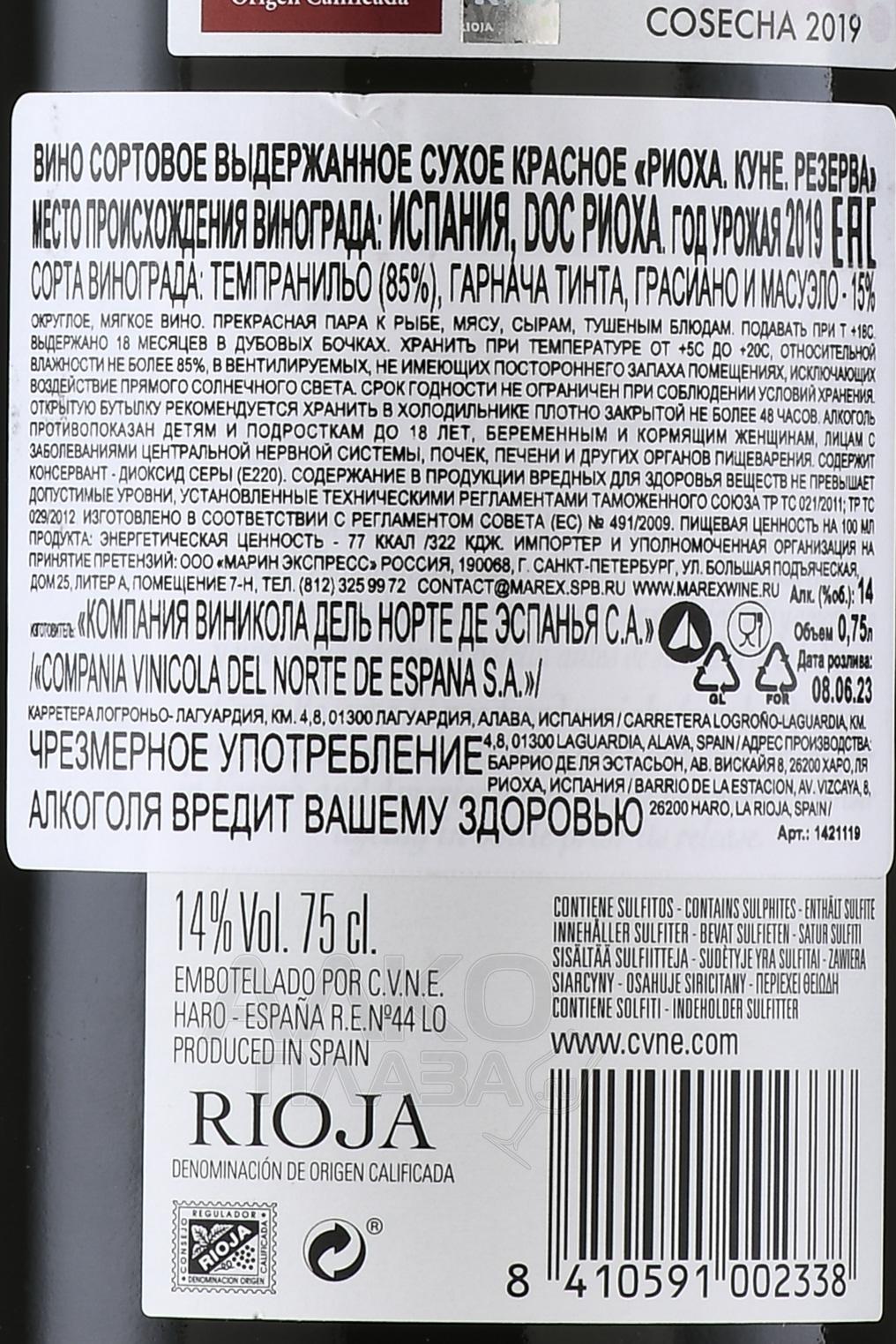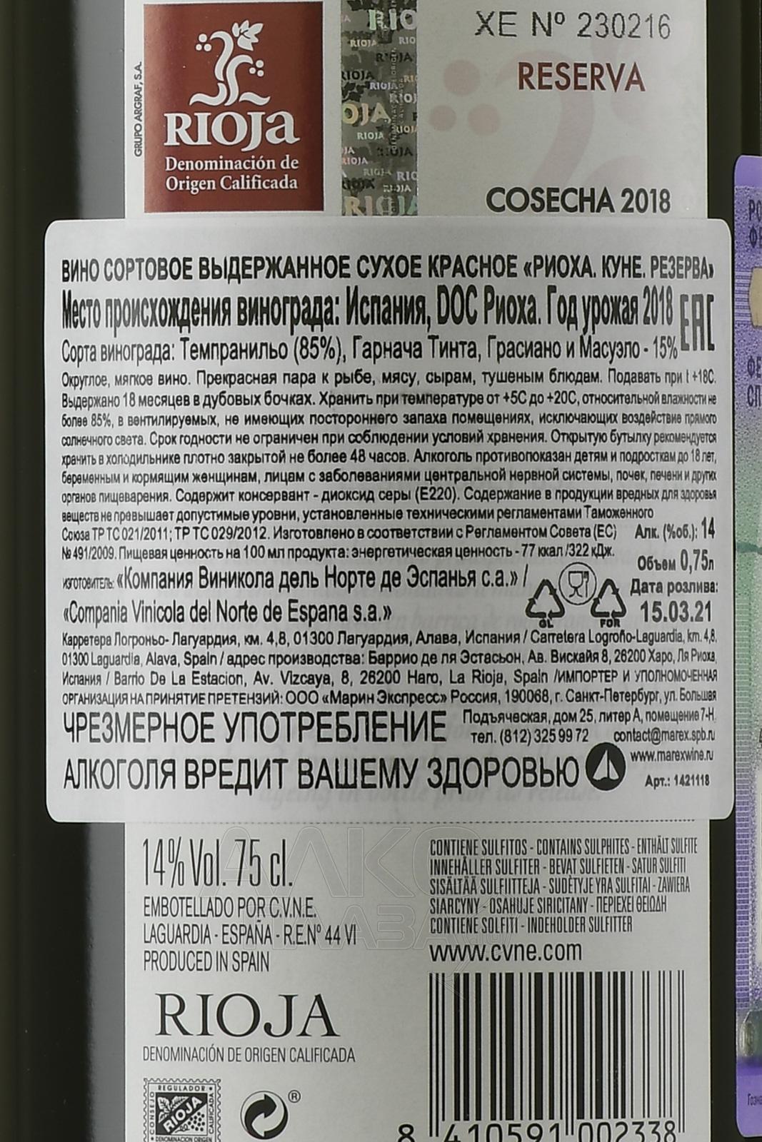 Красное сухое вино Cune Reserva Rioja 2018 г. 0,75 л создано из урожаев одного года. В купаж вошли ягоды четырех популярных в Испании сортов винограда, выращенные на собственных плантациях старинной семейной винодельни. Плоды собрали вручную с 20-25-летних лоз в деревнях Родезно, Вильяльба и Аро провинции Риоха-Альта на высоте от 500 до 600 метров над уровнем моря. Сезон порадовал традиционной снежной зимой и теплым летом, благодаря чему винограда созрел с оптимальными органолептическими показателями. Сбор начался 19 сентября и завершился 26 октября с хорошим прогнозом по качеству сырья. Винификация проходила как обычно – в чанах из нержавеющей стали вместимостью 20 тонн при контролируемой температуре. после 18 дней на мезге и спонтанной яблочно-молочной ферментации сусло отжали и выдержали 1,5 года в американском и французском дубе. Еще 12 месяцев напиток провел в бутылках.
