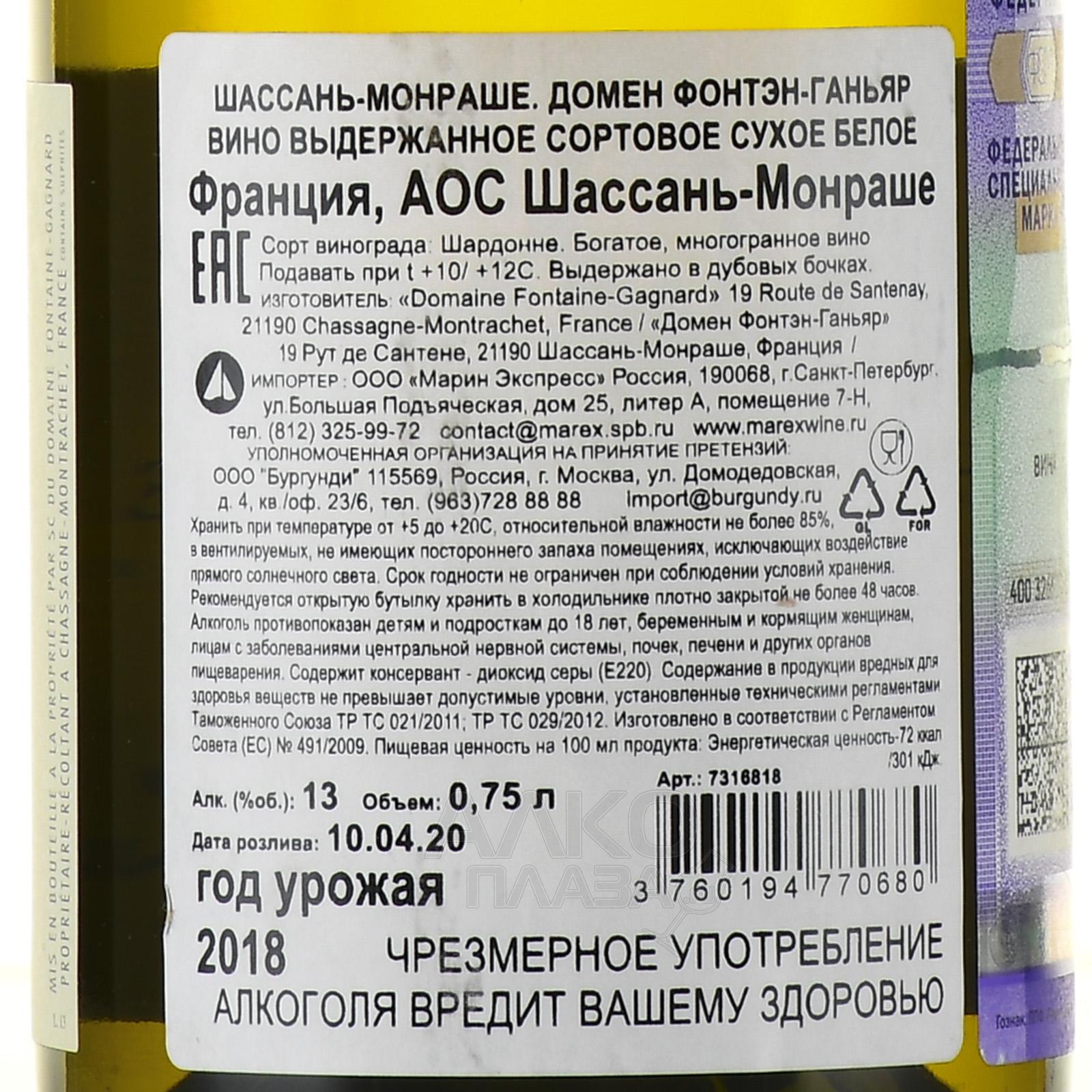 Белое сухое вино Domaine Fontaine-Gagnard Chassagne-Montrachet AOC 0,75 л создано в одном из лучших апелласьонов Бургундии — Шассань-Монраше. В роли сырья выступает классический европейский сорт Шардоне, который выращивается на меловых почвах, собирается вручную и подвергается традиционной винификации. Сусло сбраживают в стали при контролируемой температуре. Вино выдерживается 12 месяцев в бочках из французского дуба и разливается в бутылки после легкой фильтрации.