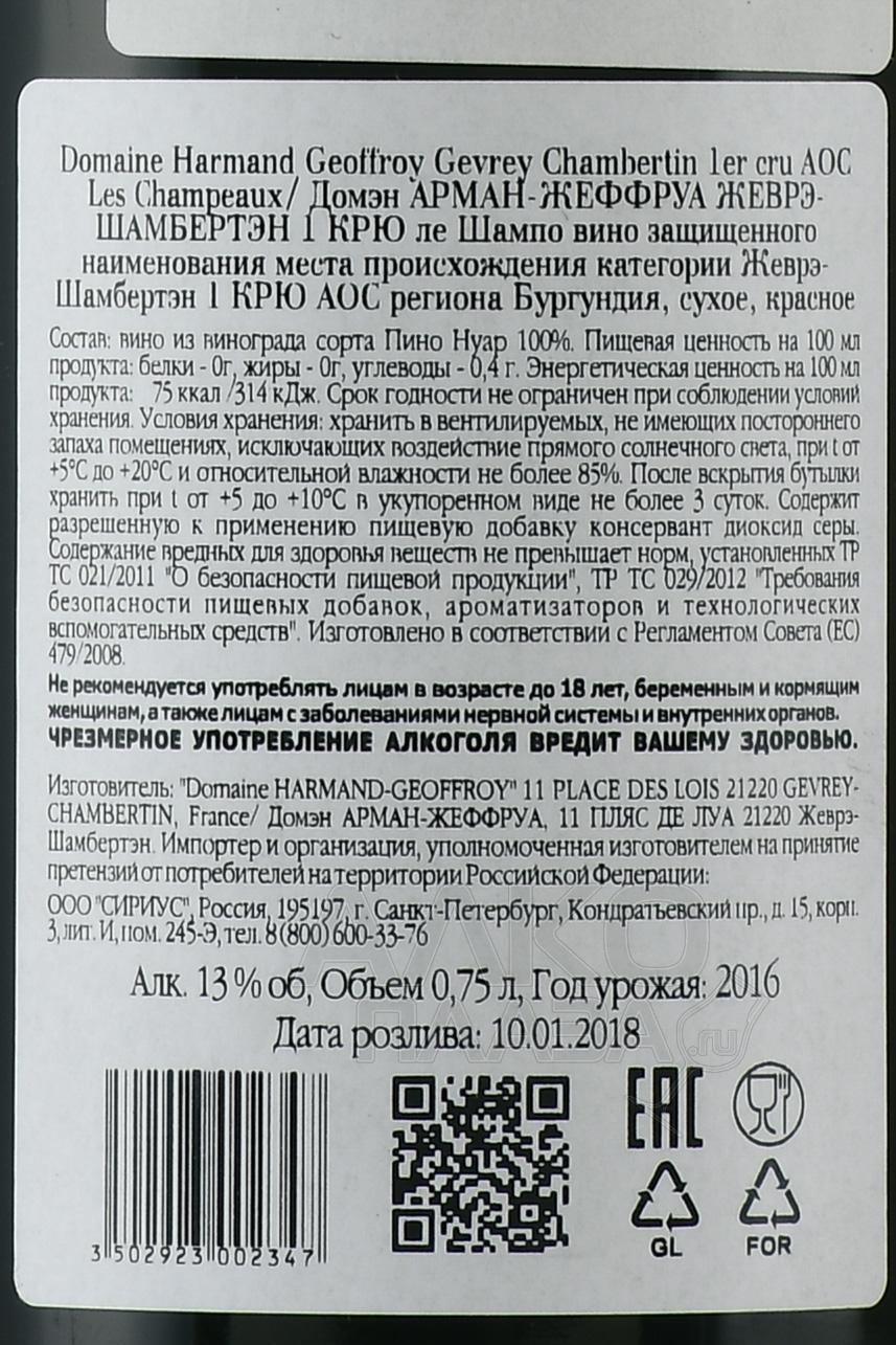 Красное сухое вино Domaine Harmand-Geoffroy Gevrey-Chambertin 1er Cru Les Champeaux 0.75 л защищенного наименования места происхождения — это моносепажный бургундский напиток супер-премиум-класса, созданный из сорта Пино Нуар, выращенного на винограднике Ле Шампо в Жевре-Шамбертене и собранного ручным методом в один урожайный год. Лозы имеют очень солидный возраст. После ферментации вино выдерживается в бочках из древесины французского дуба. Производитель рекомендует перед дегустацией напиток декантировать для того, чтобы вкусоаромат раскрылся в полной мере.
