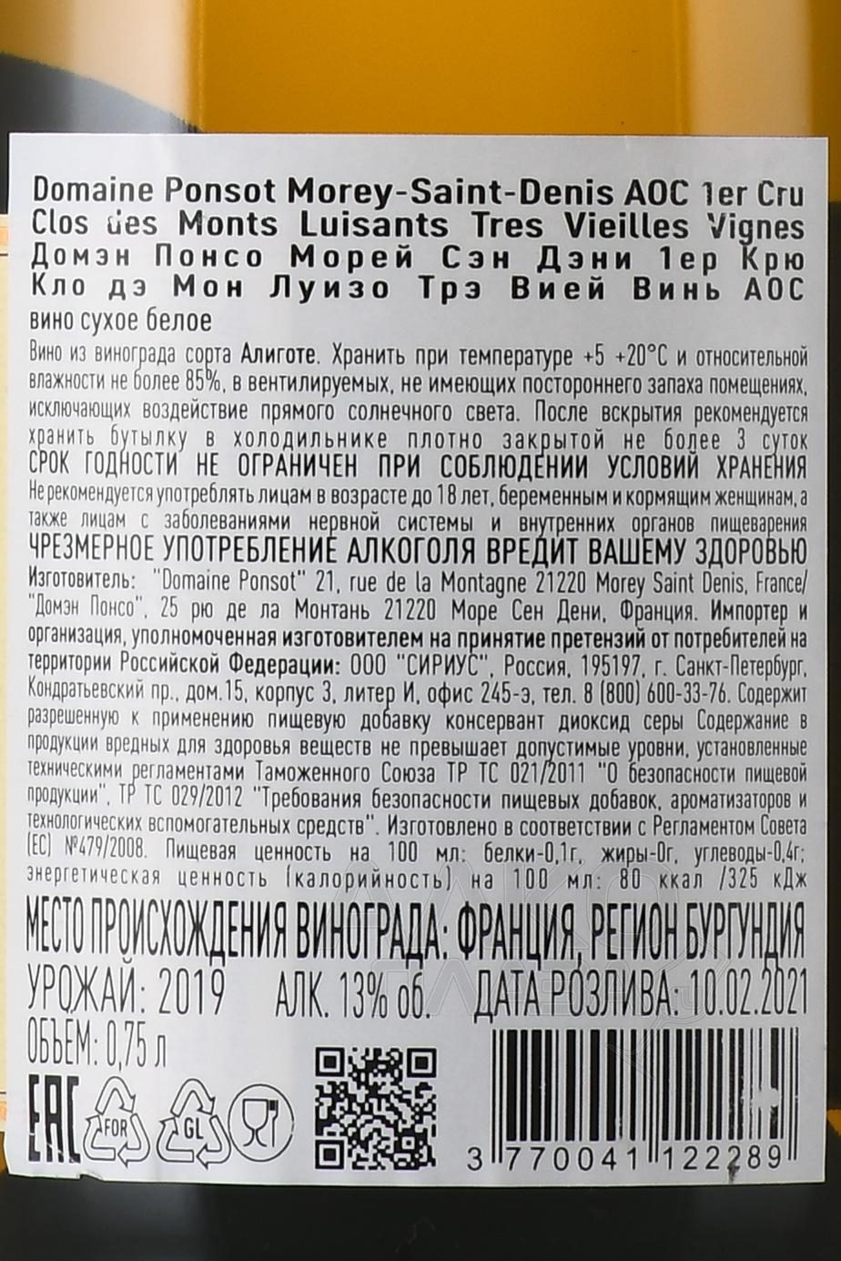 Белое сухое вино Domaine Ponsot Morey-Saint-Denis 1er Cru Clos des Monts Luisants Tres Vieilles Vignes 2019 г. 0,75 л создано на заводе французской семейной компании из местности Море-Сен-Дени (регион Бургундия) в соответствии с традиционной методикой. Виноград сорвали со старых лоз участка классификации Премьер Крю в течение одного года и отправили на ферментацию с термоконтролем, после чего сусло выдерживалось в 15-летних французских барриках.