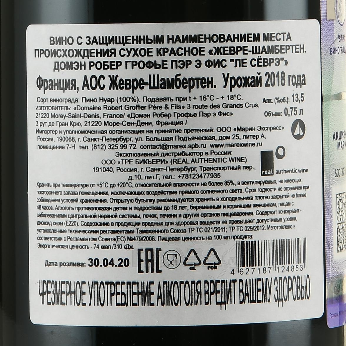 Domaine Robert Groffier Pere & Fils Gevrey-Chambertin Les Seuvrees 0,75 л – красное сухое моносортовое вино из ягод Пино Нуар. Урожай для его изготовления собран на винограднике Ле Севрес в коммуне Жевре-Шамбертен – самой северной в бургундском субрегионе Кот де Нюи. Лозы, на которых созрели плоды, достигли возраста 40 лет. На винодельне сырье частично очистили от гребней, а затем подвергли холодной мацерации и ферментации. Сброженное сусло разлили в дубовые бочки и выдержали около года. Бутилирование прошло без фильтрации. Вино характеризуется превосходным потенциалом к хранению и может развиваться в бутылке на протяжении 10-15 лет.