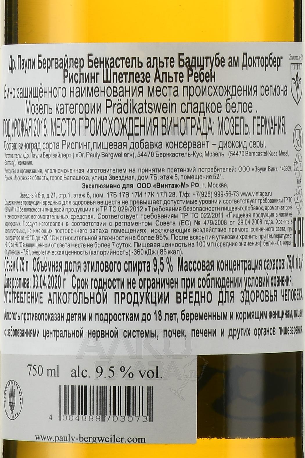 Белое сладкое вино Dr. Pauly Bergweiler Benkasteler Badstube Doctorberg Riesling Spatlese Alte Reben 2018 г. 0,75 л с уровнем содержания алкоголя 9,5 градуса выпускается в ассортименте напитков компании из региона Мозель-Саар-Рувер. Виноград с ценных участков низкой урожайности, где на каменистых сланцевых почвах произрастают лозы возрастом от 70 лет, был собран ручным способом. Обработка прошла на инновационном оборудовании с постоянным контролем качества и температурного режима.