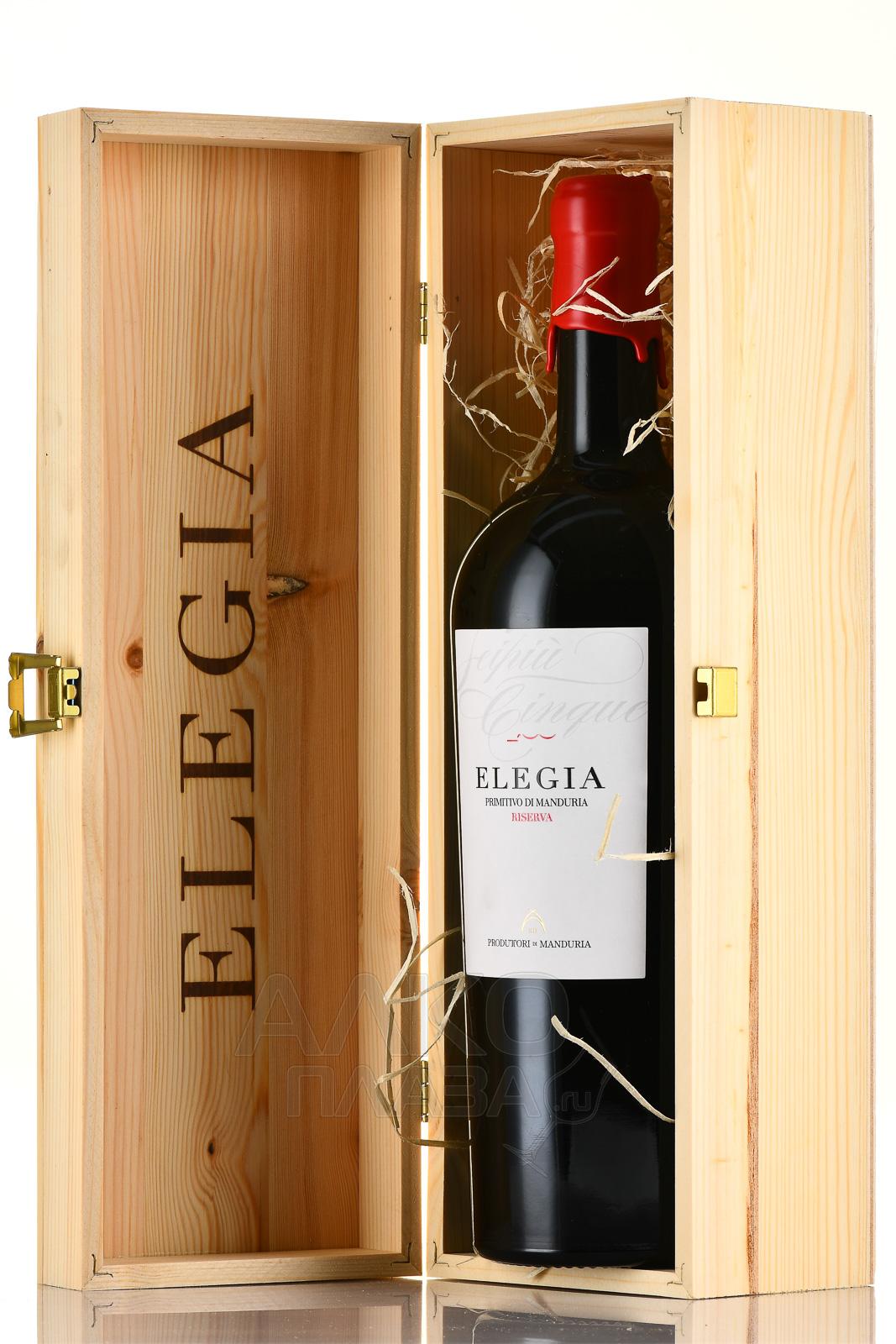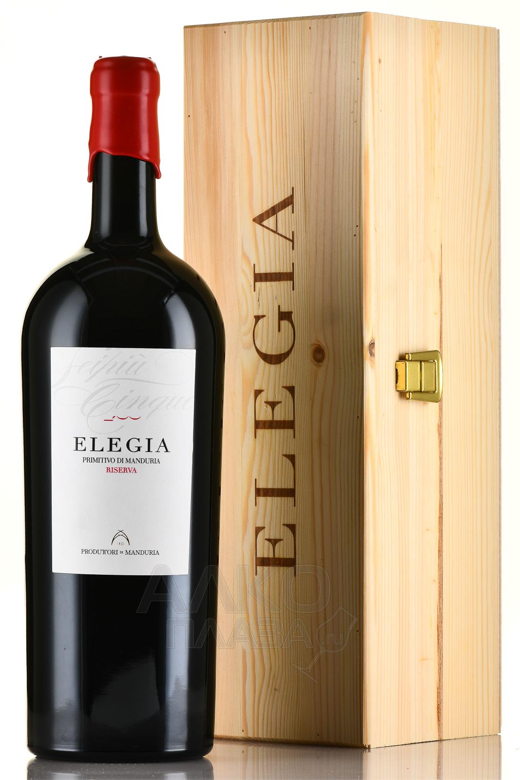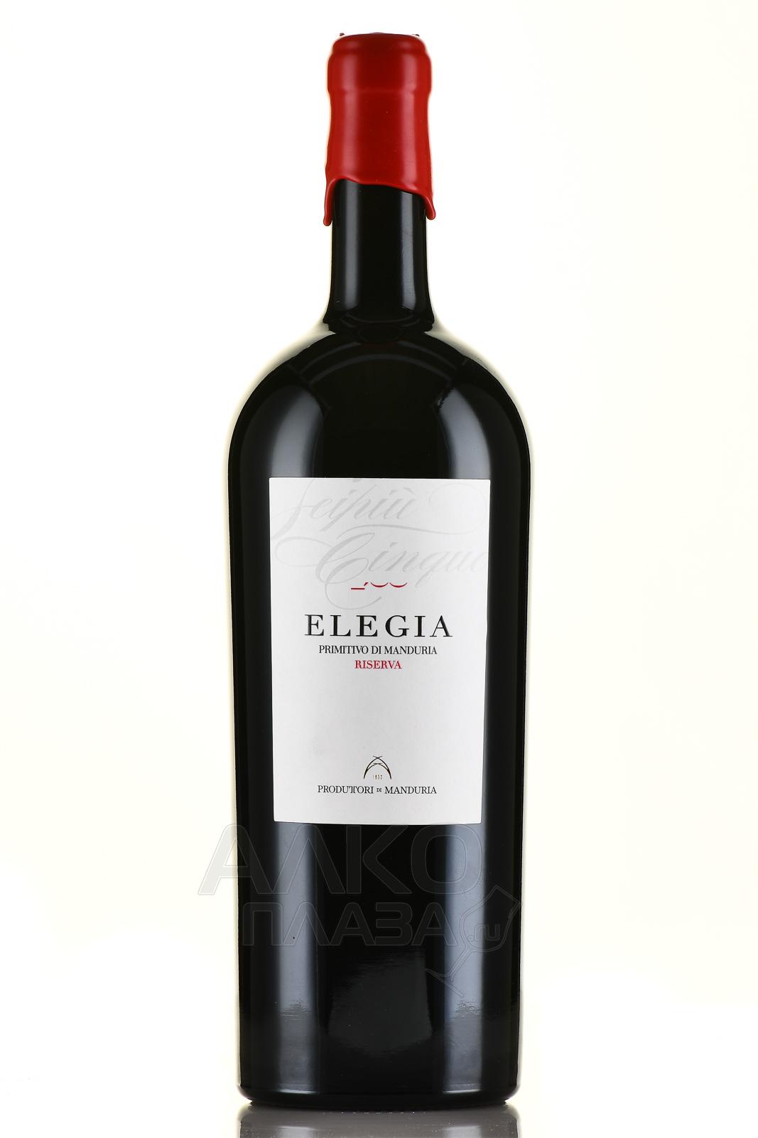 Красное полусухое вино Elegia Primitivo di Manduria Riserva DOC - элегантное вино с ярким, выразительным ароматом, наполненным оттенками черных фруктов, ягод, таких как черника, ежевика. Букет дополняют ноты варенья из чернослива, малины, а так же нюансы специй.