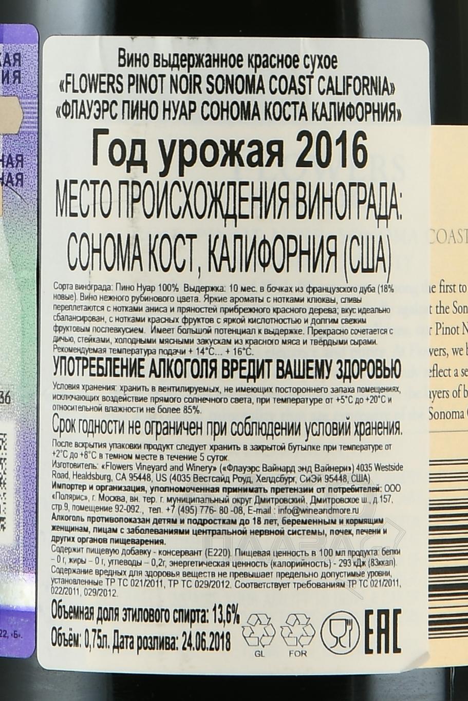 Красное сухое вино Flowers Pinot Noir Sonoma Coast California 2016 г. 0,75 л — элитный калифорнийский алкоголь с моносепажным составом, в котором присутствует спелый виноград округа Сонома. В этом качестве выступил традиционный сорт одинакового года сбора, прошедший гребнеотделение и сбраживание в чанах открытого типа. Многогранный дегустационный профиль вина со спиртуозностью 13,6% сформировала 14-месячная выдержка во французском дубе. Спиртное выпустили без фильтрации и осветления.