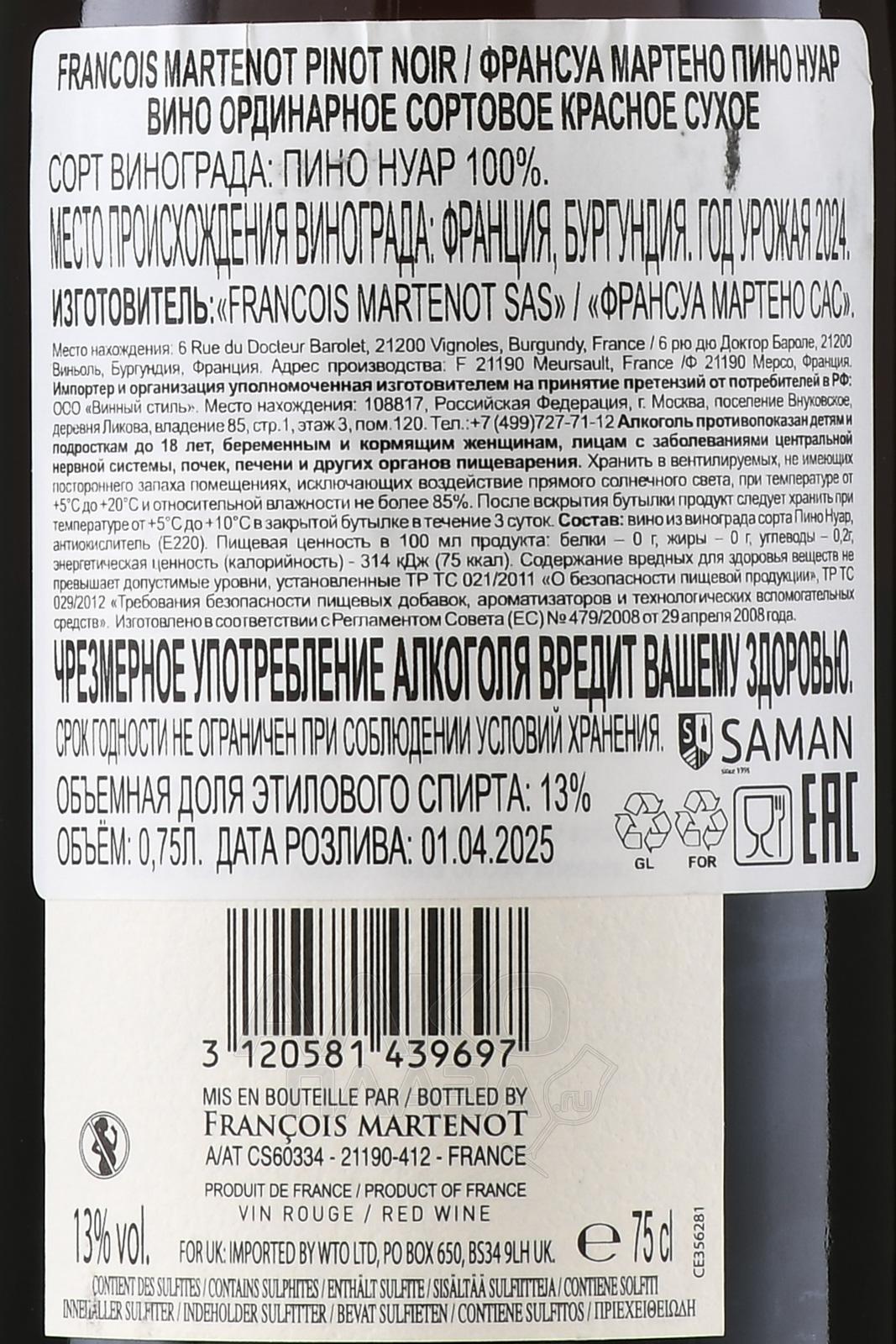 Francois Martenot Pinot Noir - вино Франсуа Мартено Пино Нуар 0.75 л красное сухое