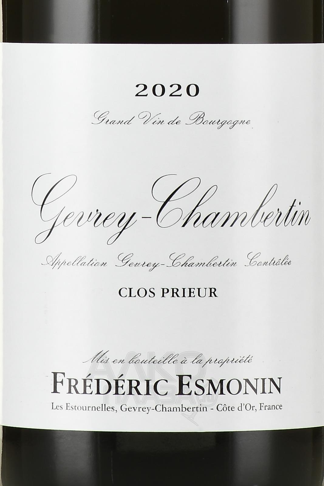 Красное сухое вино Frederic Esmonin Gevrey-Chambertin Clos Prieur 2020 г. было создано в Бургундии (Франция) из винограда одного года сбора, выращенного на плантациях виноградника Кло Приер. Одна из его частей имеет обозначение Premier Cru, другая не классифицирована. Ягоды, прошедшие холодную мацерацию и сбраживание, вызревали в дубовых бочонках разного возраста сроком до 16 месяцев. Вино крепостью 12,5% отличается большим потенциалом к хранению — от 15 до 20 лет.