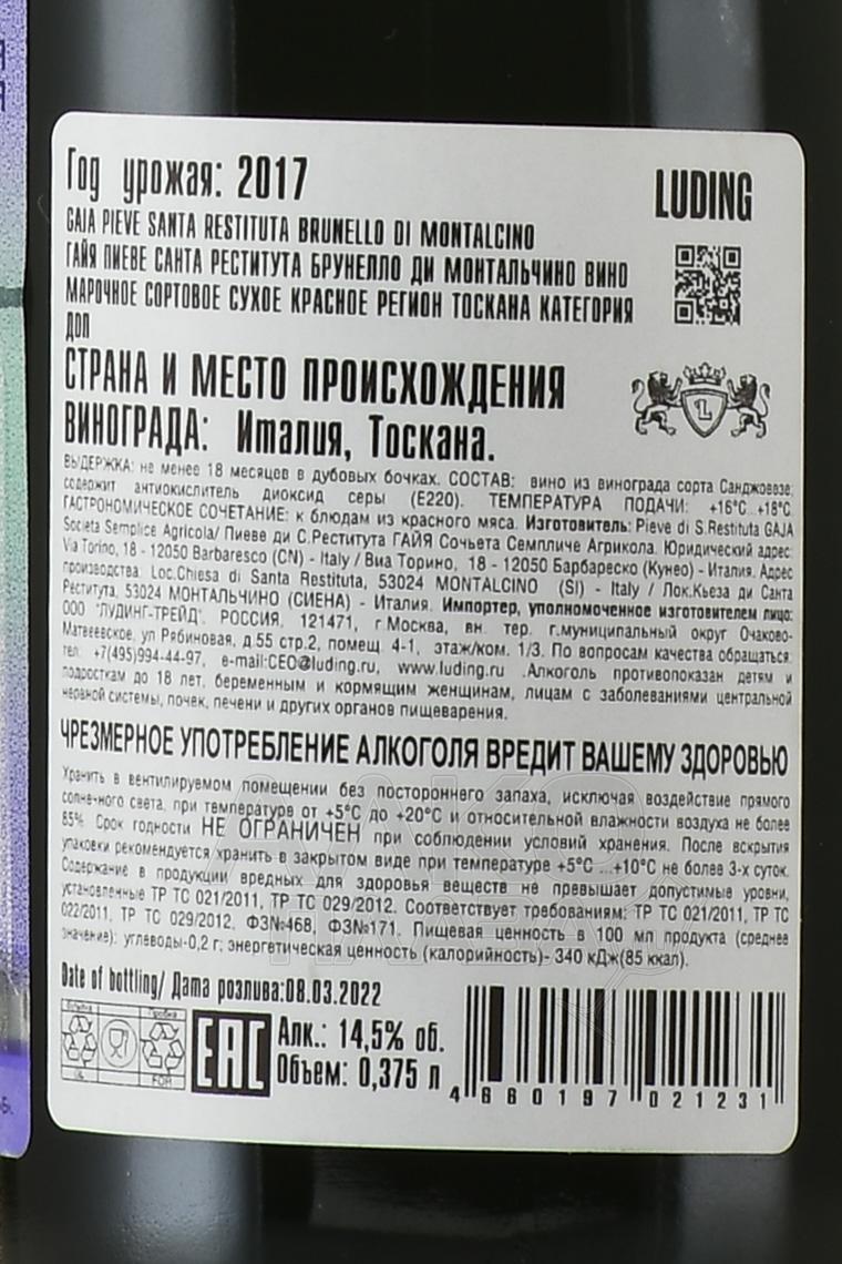 Красное сухое вино Gaja Pieve Santa Restituta Brunello di Montalcino DOP 2017 г. 0,375 л представлено в бутылке уменьшенного объема и может быть приобретено с целью знакомства с легендарным тосканским брендом Гайя. Для производства использовался урожай одного конкретного года, который был признан удачным. В роли сырья выступал сорт Санджовезе Гроссо с двух виноградников — Rennina и Sugarille, расположенных на холмах Монтальчино. Возраст лоз в среднем составляет 25 лет. Вино 2 года выдерживалось в дубовых бочках и еще год «отдыхало» в бетонных чанах. Потенциал хранения в бутылке — не менее 20 лет.