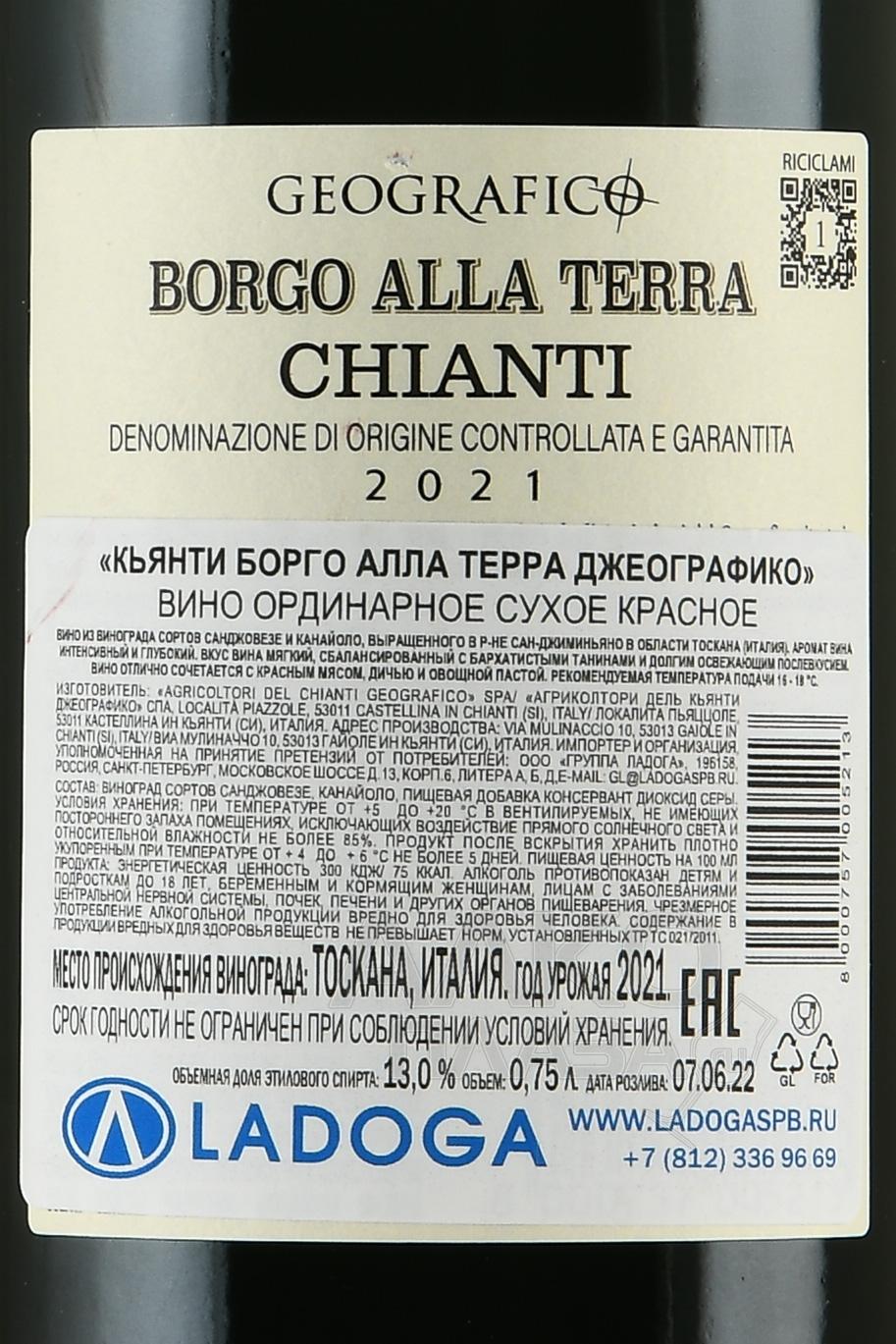 Красное сухое вино Geografico Borgo alla Terra Chianti 0,75 л происходит из культовой тосканской провинции Кьянти, а точнее – из зоны Колли Сенези с престижным статусом DOCG. Лозы здесь произрастают на склонах холмов, сложенных из песка, глины и гальки, а юго-западная экспозиция обеспечивает обильное солнечное освещение. Насыщенный профиль напитка, созданного традиционным методом винификации, максимально раскрывается после декантации.