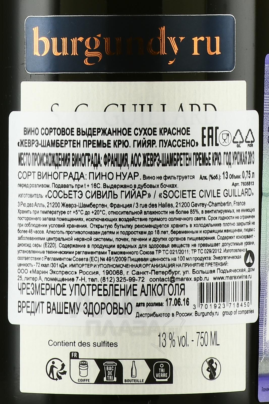 Красное сухое вино Gevrey-Chambertin Premier Cru Guillard Poissenot 2013 года 0,75 л производит маленькая семейная «тайная» винодельня, о которой мало кто знает, покольку владельцы не пользуются современными средствами связи. Брат и сестра Мшель и Одетт Гийяр делают все по старинке, у них нет компьютеров и мобильных телефонов. Вся их жизнь — виноделие, которому они фанатично преданы. Такой подход позволяет создавать просто роскошные вина, настоящие жемчужины Бургундии, которые редко встречаются в свободной продаже. Они выпускаются маленькими партиями и сразу раскупаются. Редкий винтаж 2013 года создан из сорта Пино Нуар с виноградника Ле Пуассено категории Премье Крю, расположенный в долине Лаво. Лозы были посажены здесь на известняковых твердых почвах в 1948 году. Сбор урожая — только ручной (причем владельцы домена принимают в нем самое непосредственное участие, как и во всех остальных работах), частично сырья отделяется от гредней, частично (30%) грозди остаются целыми. Проводится холодная мацерация, затем следует ферментация с регулярными пижажем (пробивание шапки из мезги) и ремонтажем (перекачка сусла из нижней части чана наверх). Вино было выдержано во французских бочках (50%) более 2 лет и бутилировась вручную без фильтрации. Потенциал составляет 20 лет и более.