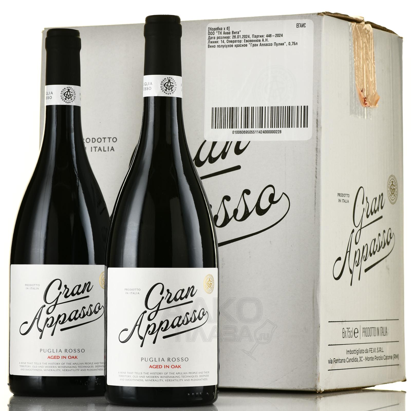 Красное полусухое вино Gran Appasso Puglia IGP 2020 г. 0,75 л содержит исключительно виноград деликатного ручного сбора — три сорта из Апулии, полученные на протяжении ограниченного по времени сезона урожая. Напиток с сахаристостью до 18 г/дм³ произвели на классическом оборудовании при соблюдении постоянного контроля качества. Виноматериал долго сбраживался без удаления кожиц в стальных баках, где поддерживался строгий температурный режим. Выдержка алкоголя также протекала в чанах на металлической основе.