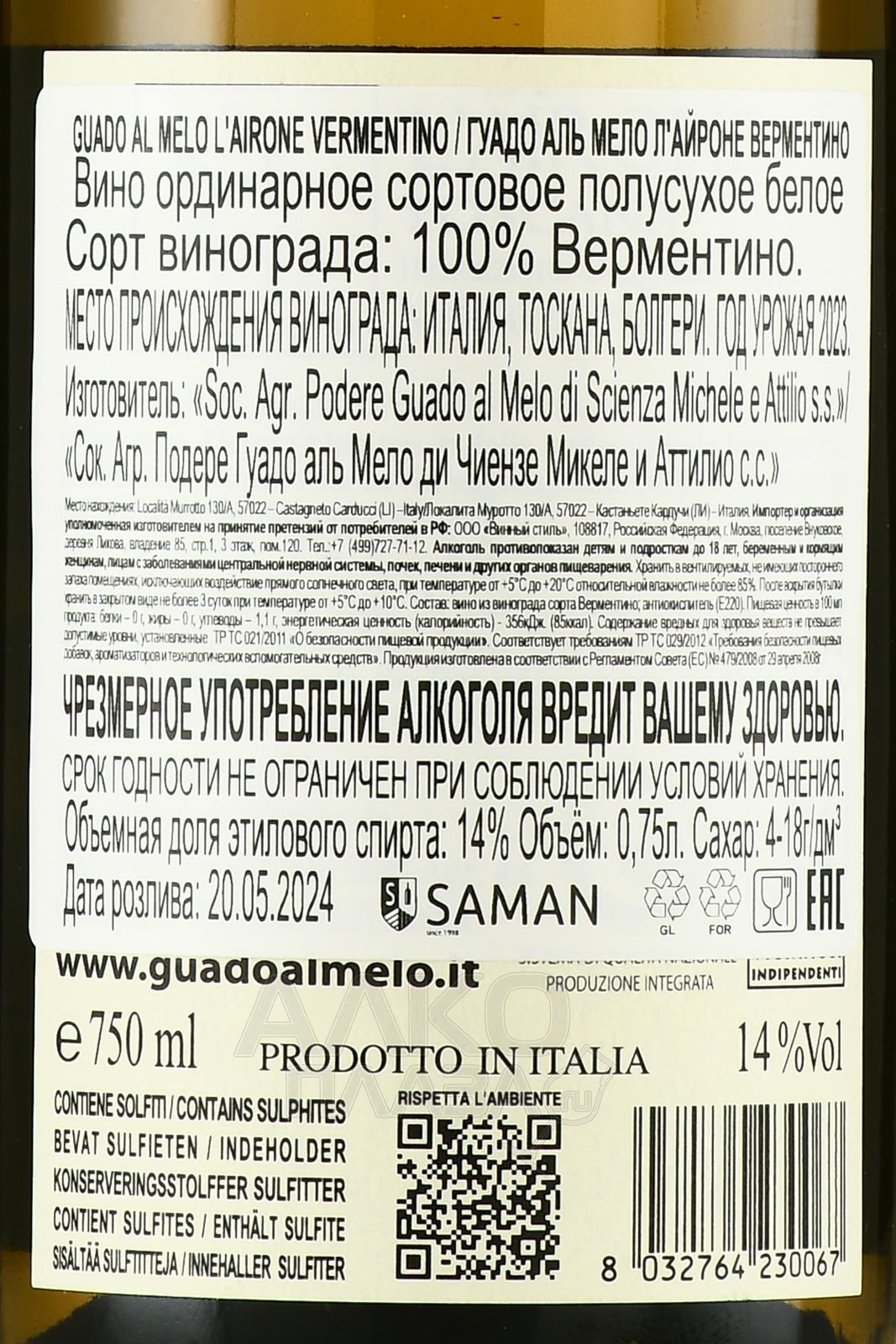 Белое полусухое вино Guado al Melo L`Airone Vermentino 2023 года 0,75 л произведено в Тоскане из традиционного для региона сорта Верментино. Оно очень свежее, сочное, ароматное, гастрономичное. На этикетке изображены цапли, которые иногда залетают на виноградники. Их оперение имеет нежно-золотистый цвет, как и оттенок восхитительного вина. Сырье для него выращивали на участках возле ручья Фосса-ди-Болгери, рядом с оливковыми деревьями и лиственным лесом. Средиземноморский климат, прохладные морские ветра, аллювиальные и глинисто-песчаные почвы придали вину терруарность и индивидуальность. Сбор урожая осуществлялся вручную в сентябре. Ягоды прошли тщательную сортировку, гребнеотделение, затем их мягко прессовали, а сусло отстаивали при низкой температуре 24 часа. Далее последовала алкогольная ферментация, после чего вино выдерживали 4 месяца в стали на тонком осадке с регулярным батонажем (перемешиванием). Перед розливом вино охлаждали, декантировали и слегка фильтровали, затем оно дозревало в бутылках еще около 3 месяцев.