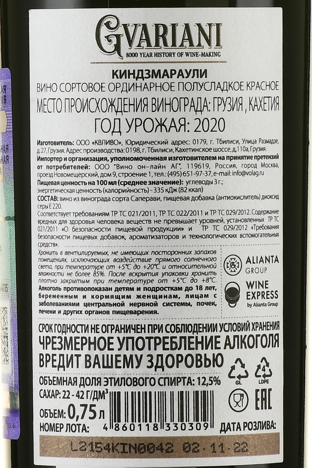 Красное полусладкое вино Gvariani Kindzmarauli 0,75 л родом из легендарной грузинской микрозоны Киндзмараули, которая располагается на территории Кахетии. Линейка Гвариани — один из брендов крупной известной компании Братья Ашкенали. В ней представлены образцы, созданные в соответствии с древними традициями грузинского виноделия. Они отличаются высочайшим качеством и несут на себе отпечаток неповторимого национального колорита. Сорт Киндзамараули производится из винограда Саперави, собранного на пике спелости. Винификация осуществлялась по классической технологии (остановка сусла путем сильного охлаждения). Вино проходило выдержку в дубовых бочках.