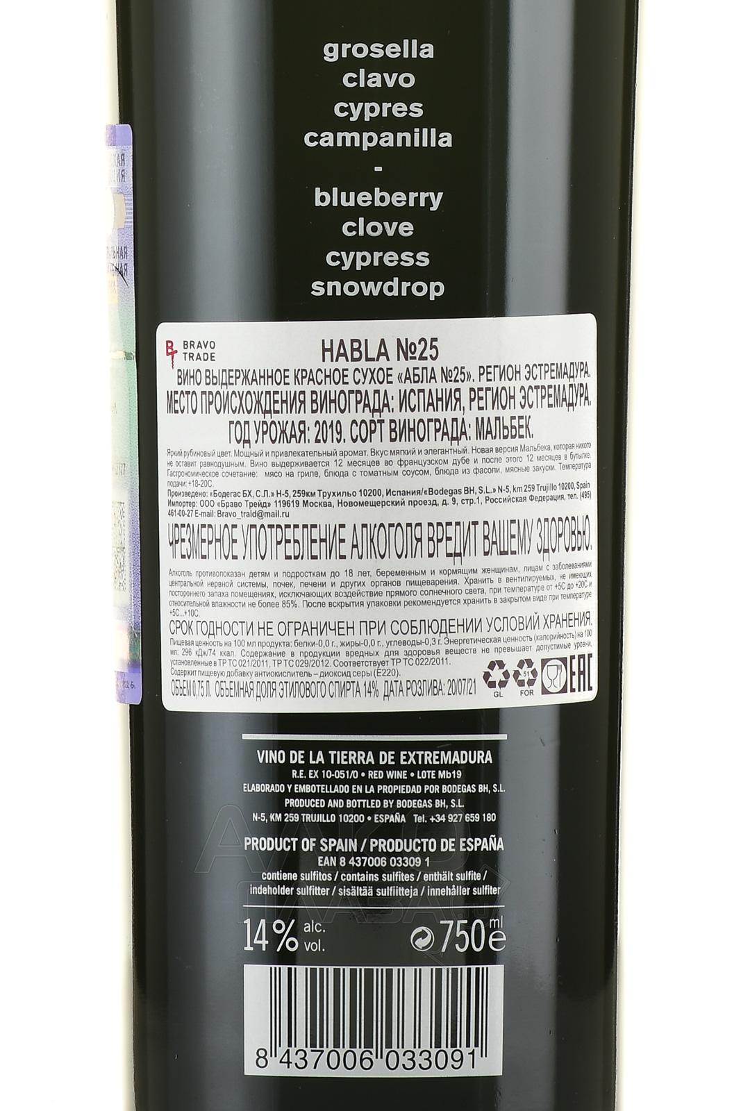 Вино красное сухое Habla №25 2019 г. 0,75 л в п/у – вариация из испанского винограда, представленная в сувенирном оформлении. Напиток создан из урожаев одного года сбора. Ягоды созрели в терруаре автономной испанской провинции Эстремадура, которая находится на юго-западе страны. После термоконтролируемой ферментации напиток созревал 12 месяцев во французском дубе и еще год – в бутылке.