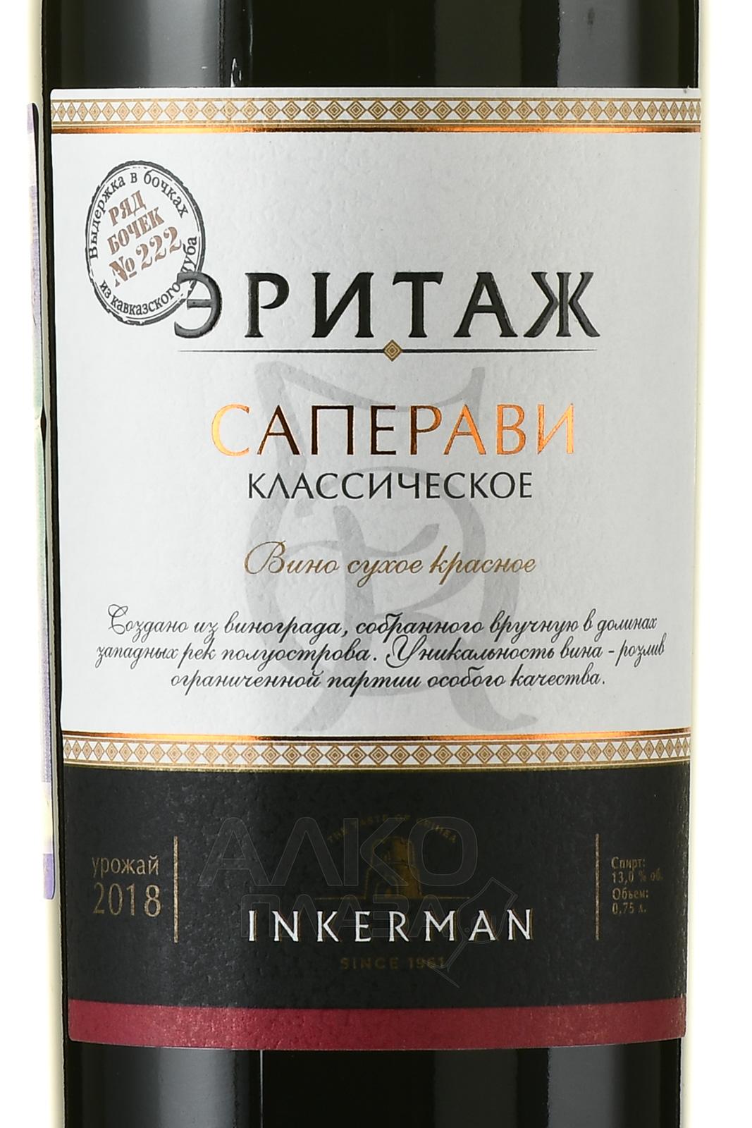 Вино Inkerman Эритаж Саперави Крымское Классическое красное сухое 0.75 л произведено из севастопольского винограда одного сорта по традиционной технологии. Напиток из особой серии завода Инкерман наделен индивидуальным стилем, поскольку каждая партия разлита из отдельной бочки. На бутылках указан номер деревянной емкости, в которой вино созревало в течение 12 месяцев. Для винификации использовались стальные чаны с контролем температуры. Моносепажный сорт содержит менее 1% сахара и относится к элитному классу.