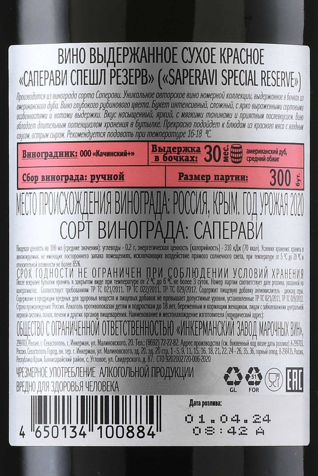 Красное сухое вино Inkerman Saperavi Special Reserve производится российской компанией с Крымского полуострова, которая использовала в роли сырья отборный спелый виноград из Альминской и Качинской долин. Ягоды подверглись процессам контролируемого сбраживания и выдержки во французских дубовых бочонках, прошедших средний обжиг, на протяжении полугода. Вино реализуется при стандартной спиртуозности (12,5%).