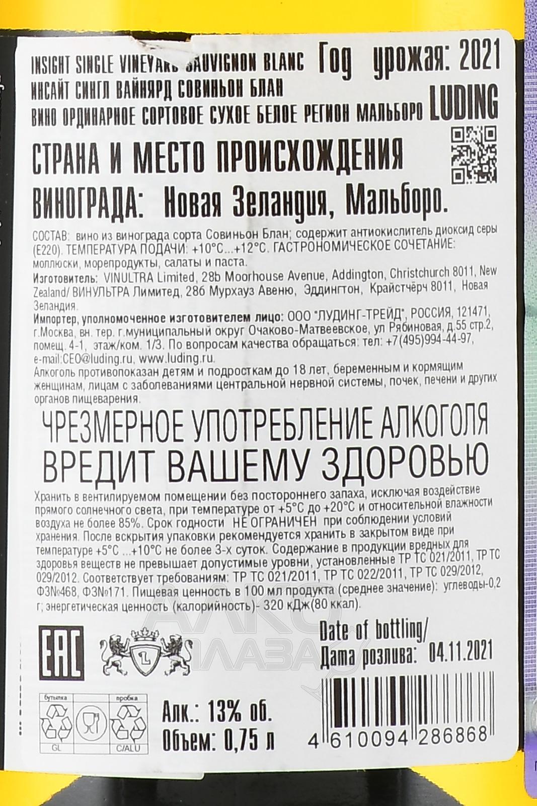 Белое сухое вино Insight Sauvignon Blanc Marlborough 2022 г. 0,75 л от молодой новозеландской компании Vinultra было изготовлено в регионе Мальборо, а сырьем для него выбрали один сорт винограда европейской группы. Ягоды отправили на обработку сразу после сбора, гребнеотделения и сортировки. Изготовление проходило с использованием прессования, контролируемой ферментации и недолгой выдержки в металлических баках.