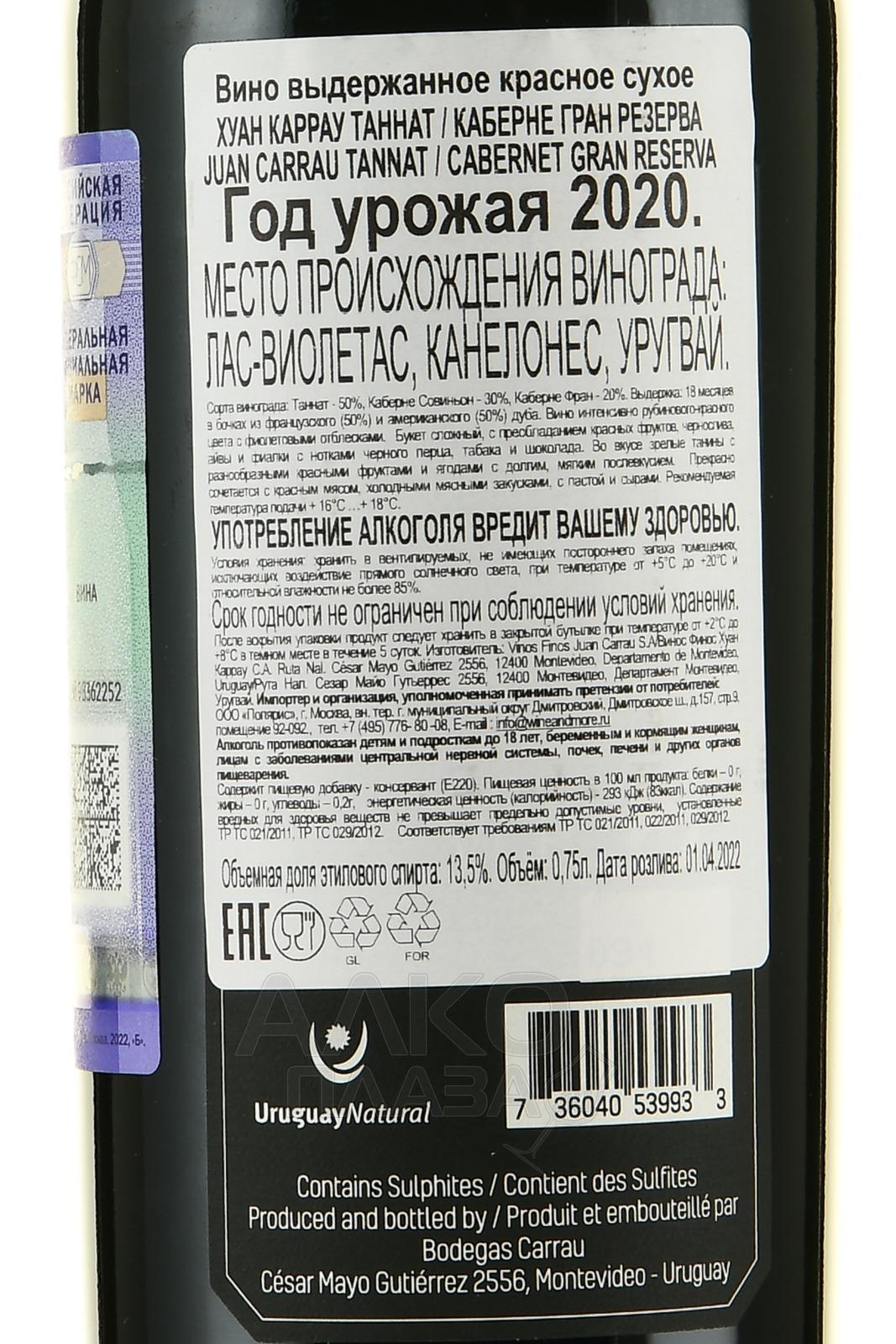 Красное сухое вино Juan Carrau Gran Reserva Tannat-Cabernet 2020 г. 0,75 л произведено семейным предприятием из Уругвая, которое выбрало сырьем для создания вариации виноград трех сортов из местности Лас-Виолетас. Его собрали в удачный с точки зрения климата сезон и отправили на обработку посредством измельчения и контролируемой ферментации (в стальных чанах поддерживалась температура не выше 25 °C). Сбраживание продолжилось в двух типах барриков. Завершающим производственным этапом стала выдержка во французском и американском дубе сроком порядка полутора лет. Перед реализацией вино год «отдыхало» в бутылках.