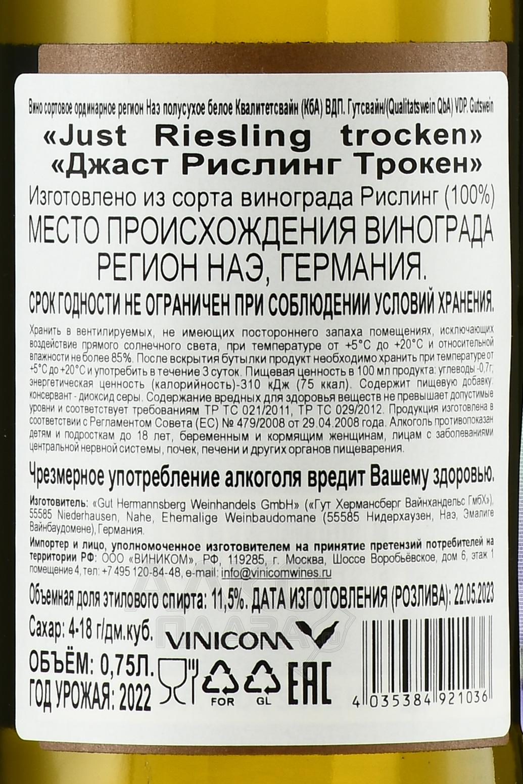 Белое полусухое вино Just Riesling Trocken 2022 г. 0,75 л – моносортовая вариация родом с крутых склонов местечка Нидерхаузен немецкого региона Наэ. Отборные урожаи одного года прошли винификацию на природных дрожжах в стальных чанах. Полгода до розлива сброженный сок созревал на тонком осадке также в резервуарах из нержавеющей стали.