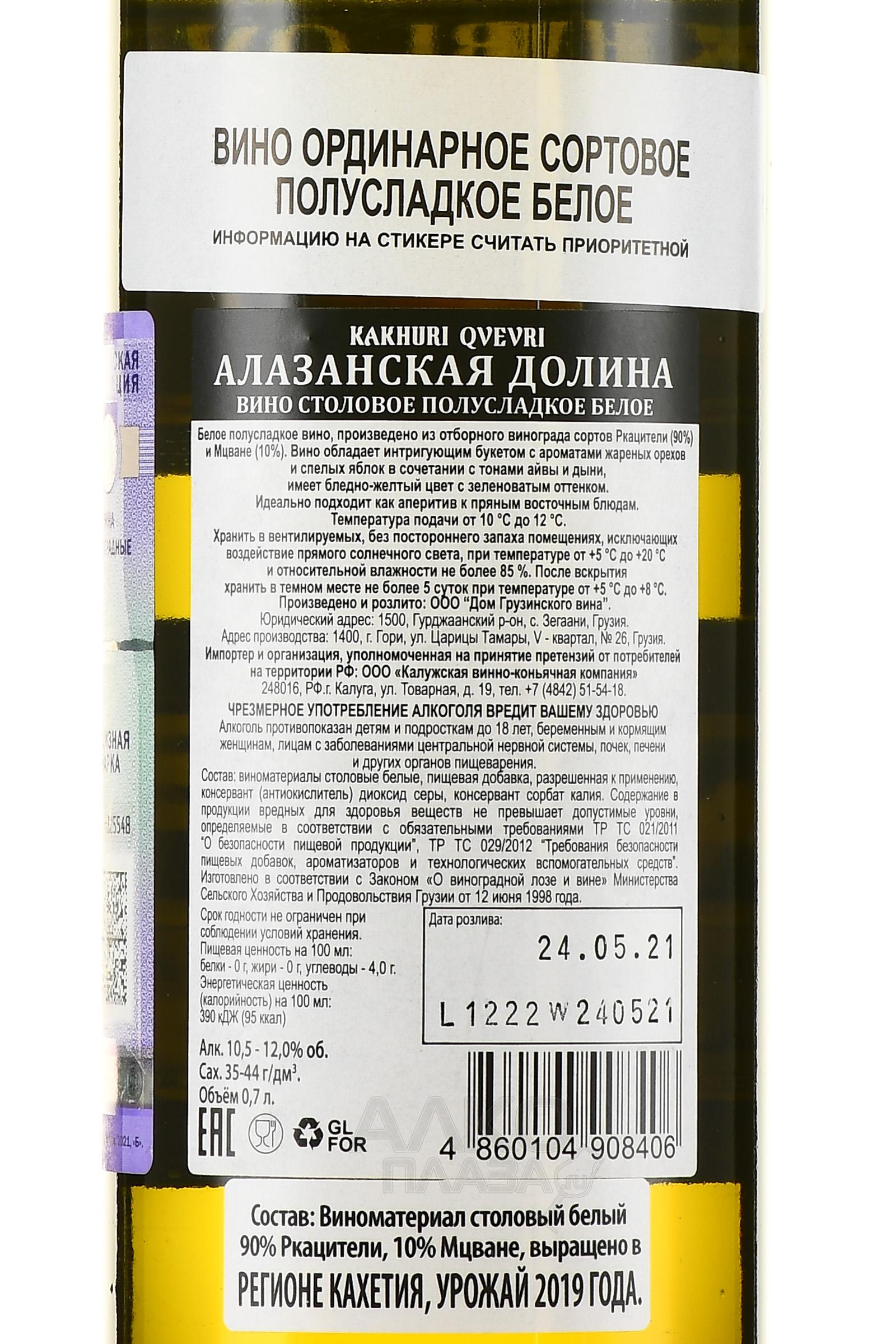 Белое полусладкое вино Kakhuri Kvevri Alazani Valley 0.75 л создано из аборигенных сортов винограда, выращенных в Кахетии. Почвенно-климатические факторы создают идеальные условия для созревания плодов. Напиток изготавливается без химикатов и искусственных удобрений. Сбор урожая происходит в момент оптимальной зрелости плодов. Ягоды мягко прессуют, брожение протекает в нержавеющих стальных цистернах при температурном контроле. После их выдерживают некоторое время в керамических сосудах - квеври. Благодаря такой комбинации способов, вино приобретает индивидуальные качества. Крепость составляет 12%.