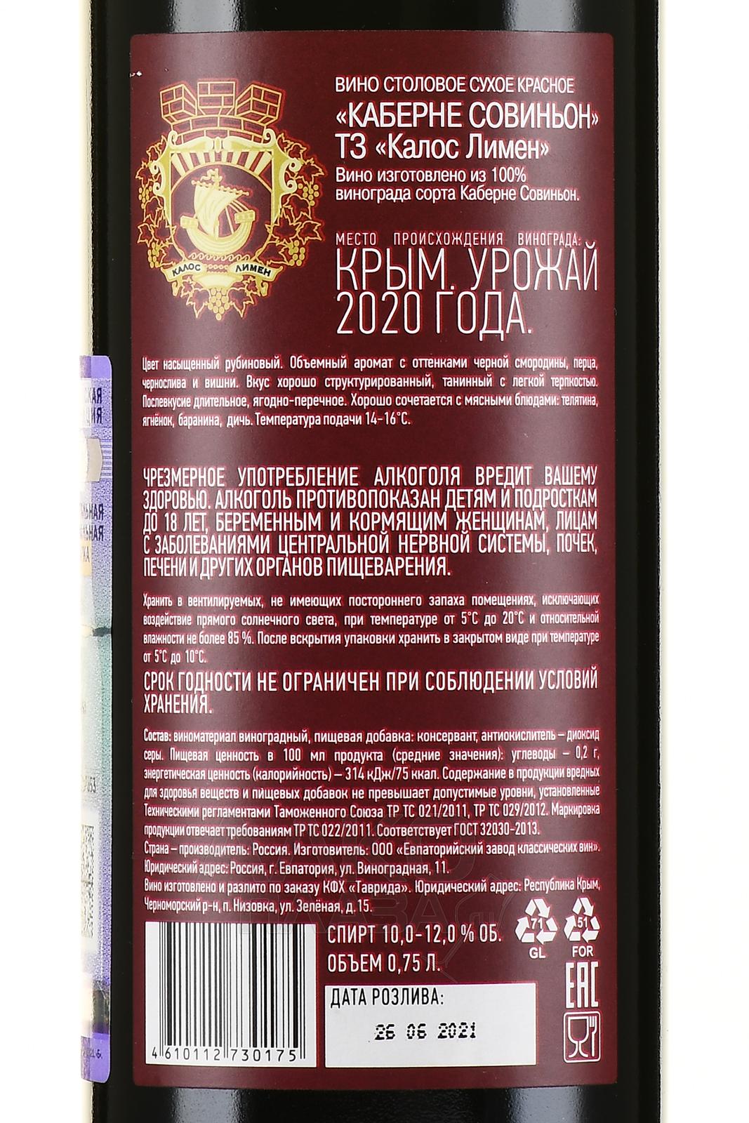Красное сухое вино Kalos Limen Cabernet Sauvignon 2020 года 0,75 л — авторское, интересное, стильное, создано из традиционного французского сорта Каберне Совиньон по технологии древних греков. Оно абсолютно натуральное, не содержит никаких добавок. Виноград для производства был выращен на собственных плантациях частного хозяйства Калос Лимен на черноморском побережье Западного Крыма, возле города Евпатория. Средний возраст лоз — 12 лет. Сбор сырья — ручной, на пике спелости, в утренние прохладные часы (для сохранения свежести ягод). Виноград отделили от гребней, мягко прессовали, затем сусло мацерировали при температуре не выше 10 градусов и ферментировали в стальных резервуарах. Вино было выдержано на тонком осадке в емкостях из нержавеющей стали 12 месяцев.