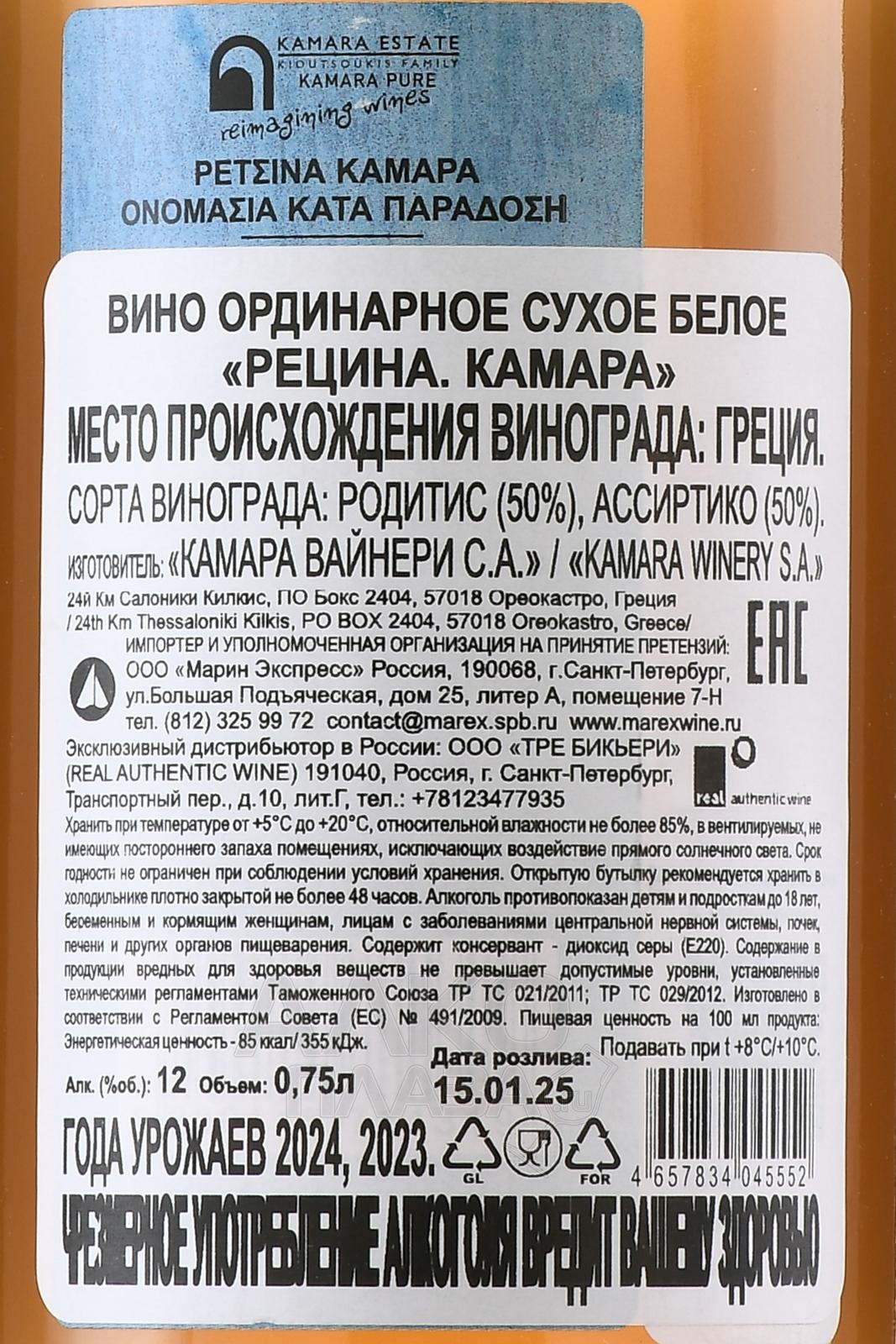 Kamara Pure Retsina - вино Камара Пюр Рецина 0.75 л белое сухое