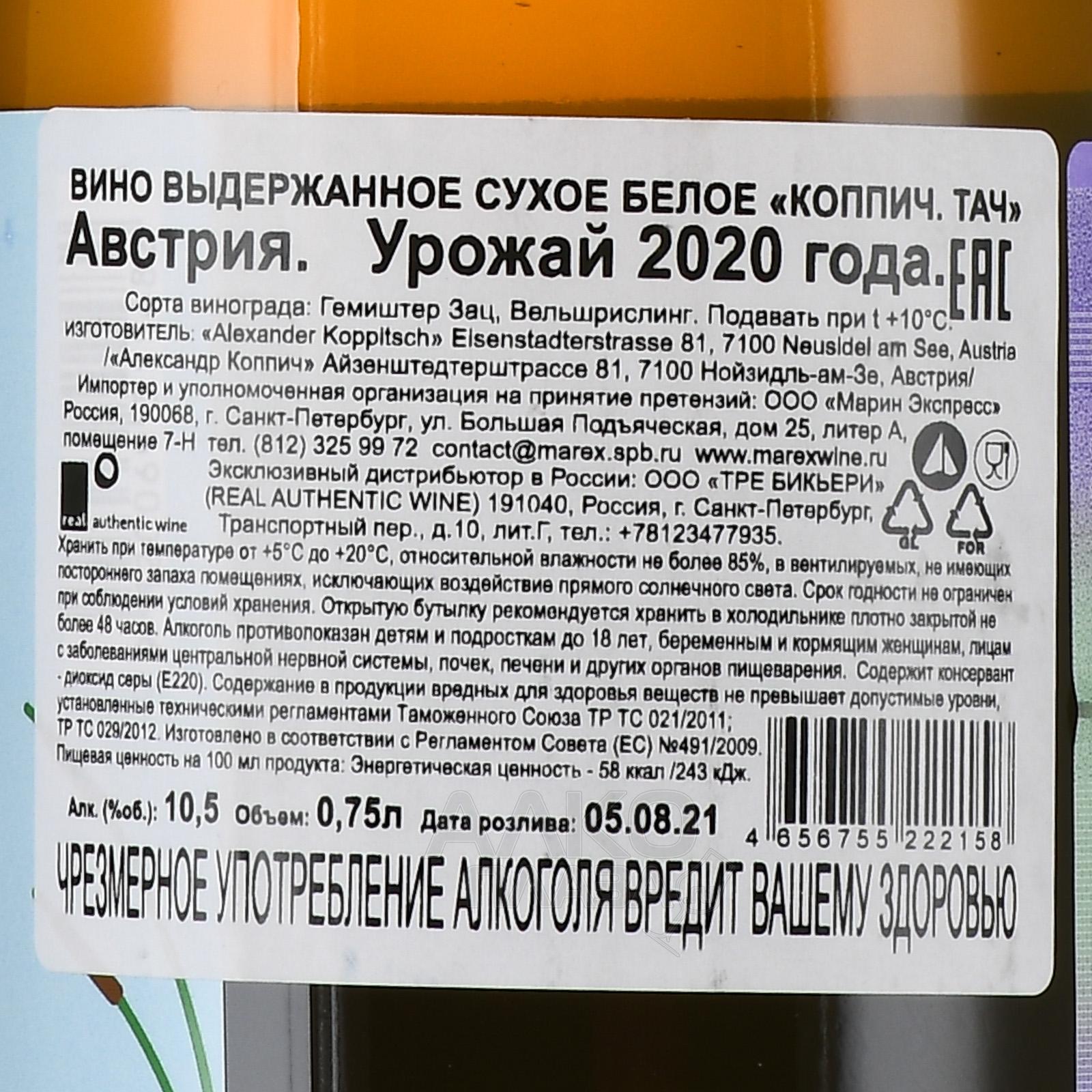 Белое сухое вино Koppitsch Touch 2020 г. — австрийский качественный винтаж из региона Бургенланд, созданный посредством долгой мацерации на кожице винограда ручного сбора, а также прессования, ферментации и выдержки на тонком осадке в бочках сроком 10 месяцев. Напиток крепостью 10,5% реализуется нефильтрованным.
