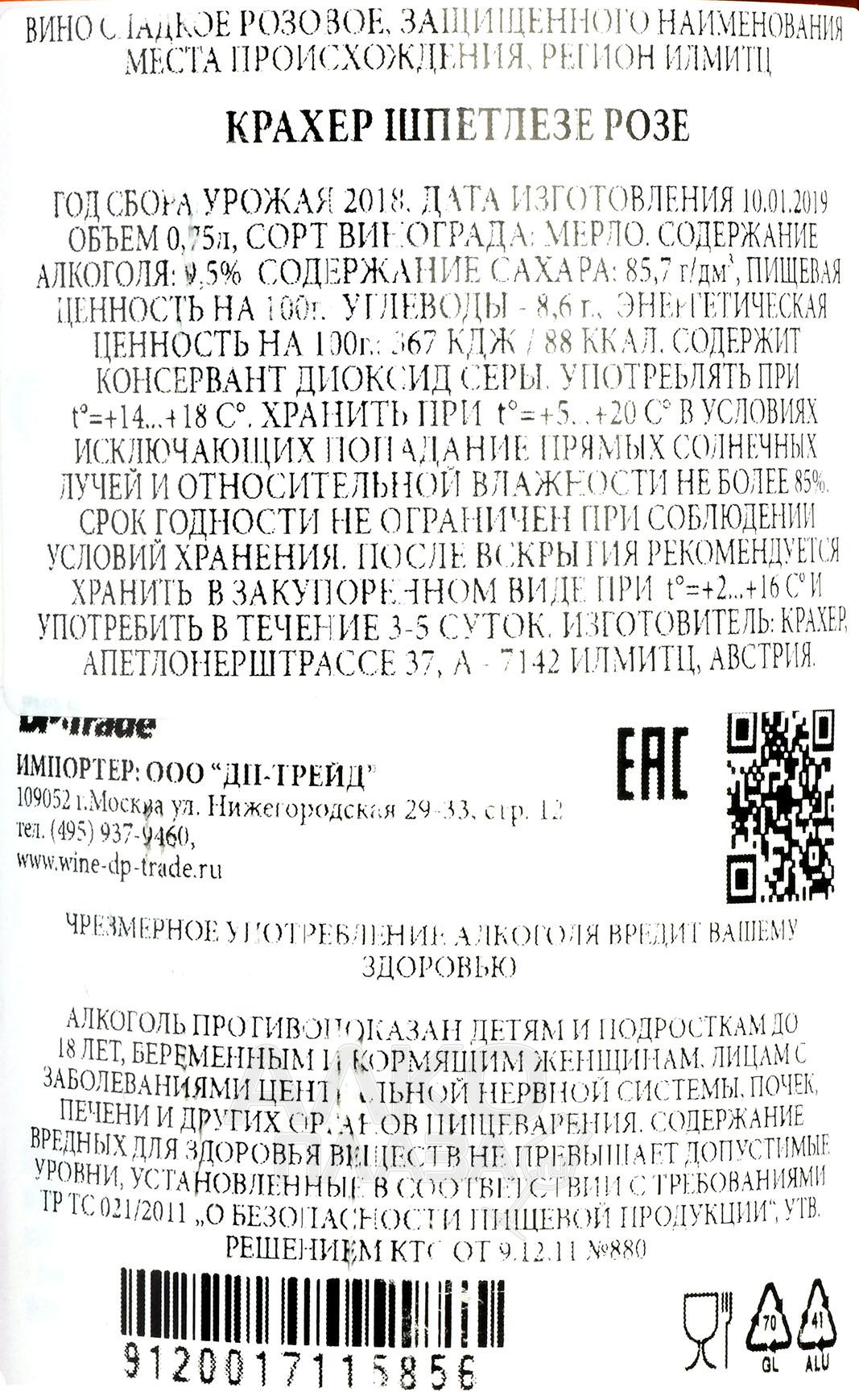 Розовое сладкое вино Kracher Spatlese Rose 0,375 л - это напиток получаемы из винограда Мерло сбор которого происходит позже чем обычно. Урожай собирают исключительно вручную. После тщательной сортировки ягоды сразу прессуют. Алкогольная ферментация происходит в нейтральных емкостях при строгом температурном режиме. Выдерживают не менее пяти месяцев в тех же емкостях.